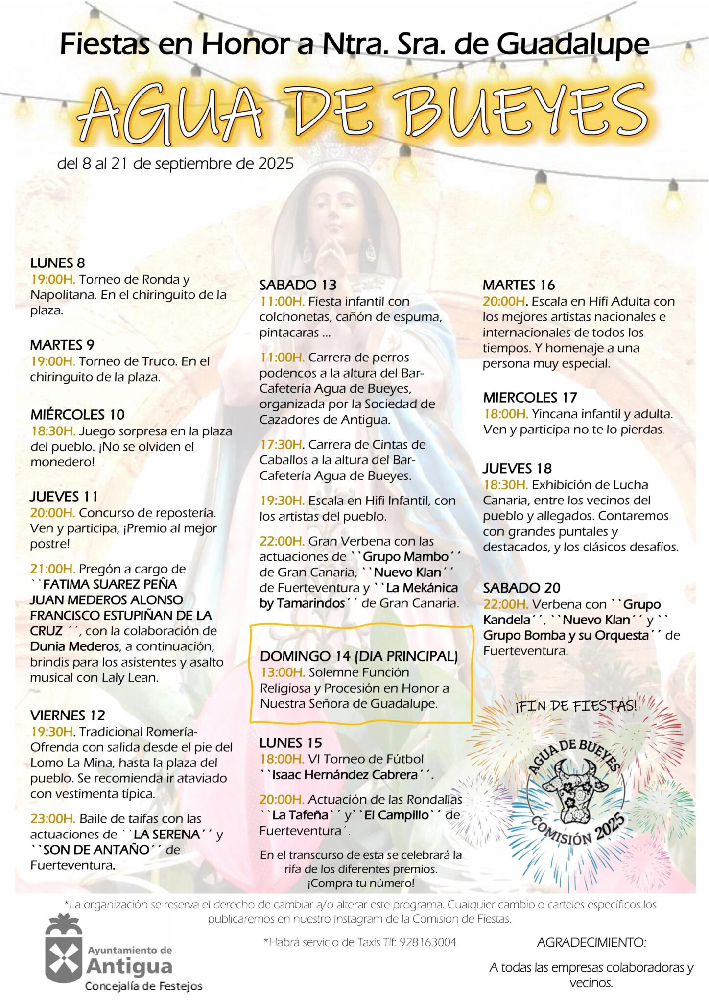 El Día Principal de las Fiestas de Agua de Bueyes, celebra este domingo 14, tras la función religiosa a las 13:00 horas, la Procesión en Honor a Nuestra Señora de Guadalupe.