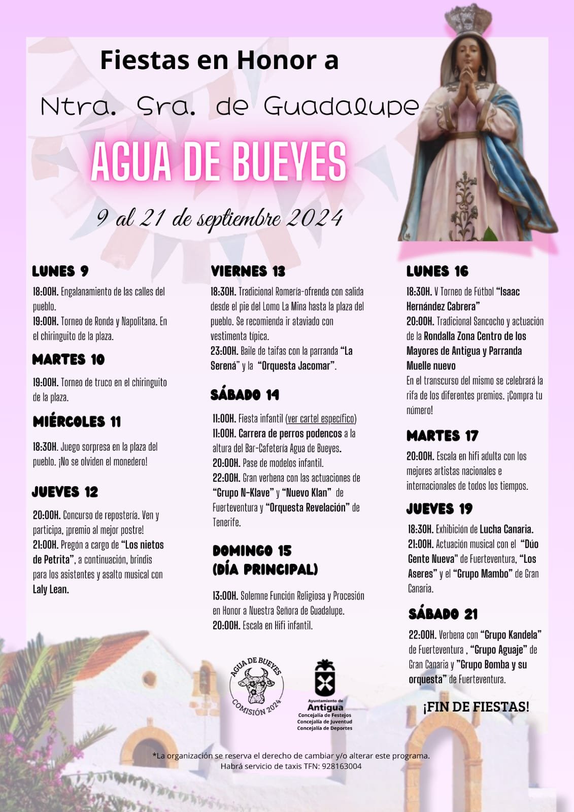 Las Fiestas en Honor a Nuestra Señora de Guadalupe se celebran hasta el sábado 21, ofreciendo un programa propuesto por la Comisión de Festejos y organizado con el Ayuntamiento de Antigua desde las concejalías de Festejos, Juventud y Deportes, explica el alcalde, Matías Peña.
