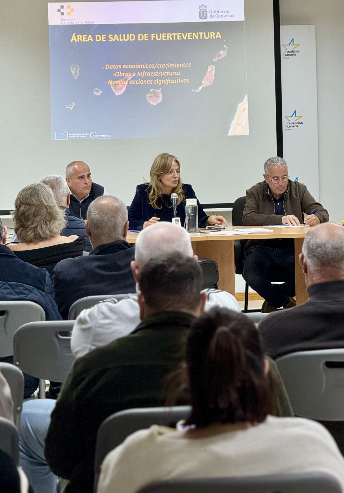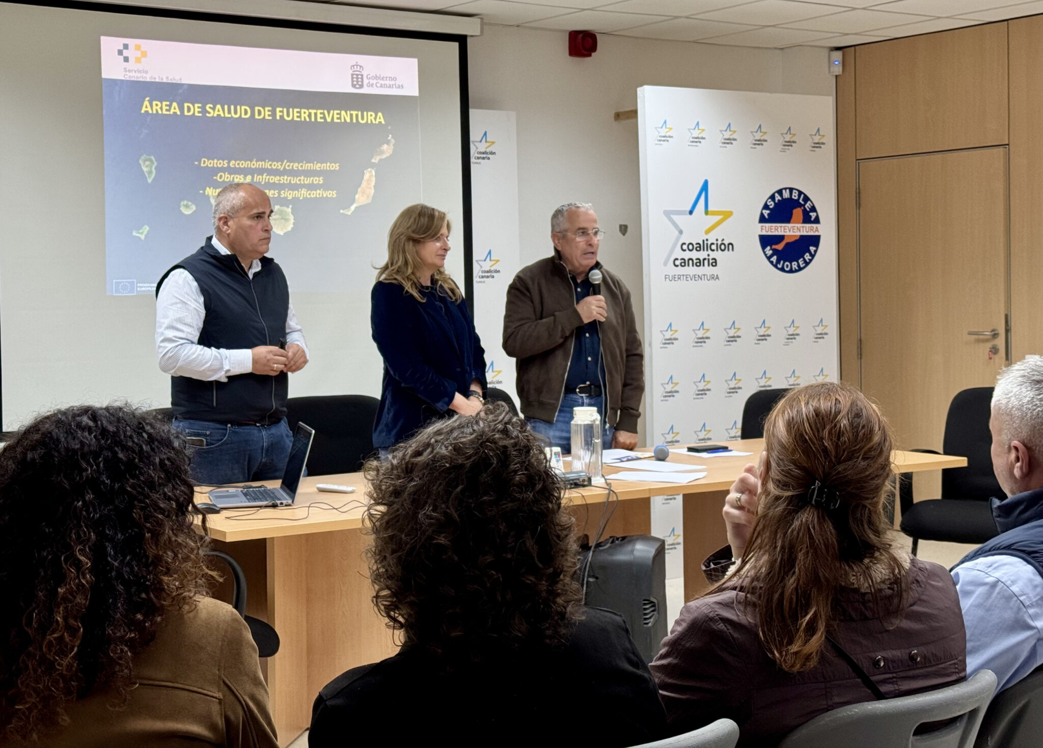 El encuentro estuvo presidido por la consejera, junto al director del Área de Salud, Tomás Pérez, quien realizó una exposición detallada de las inversiones y proyectos consignados en los presupuestos para la isla, y el secretario insular de Asamblea Majorera–Coalición Canaria, Mario Cabrera.