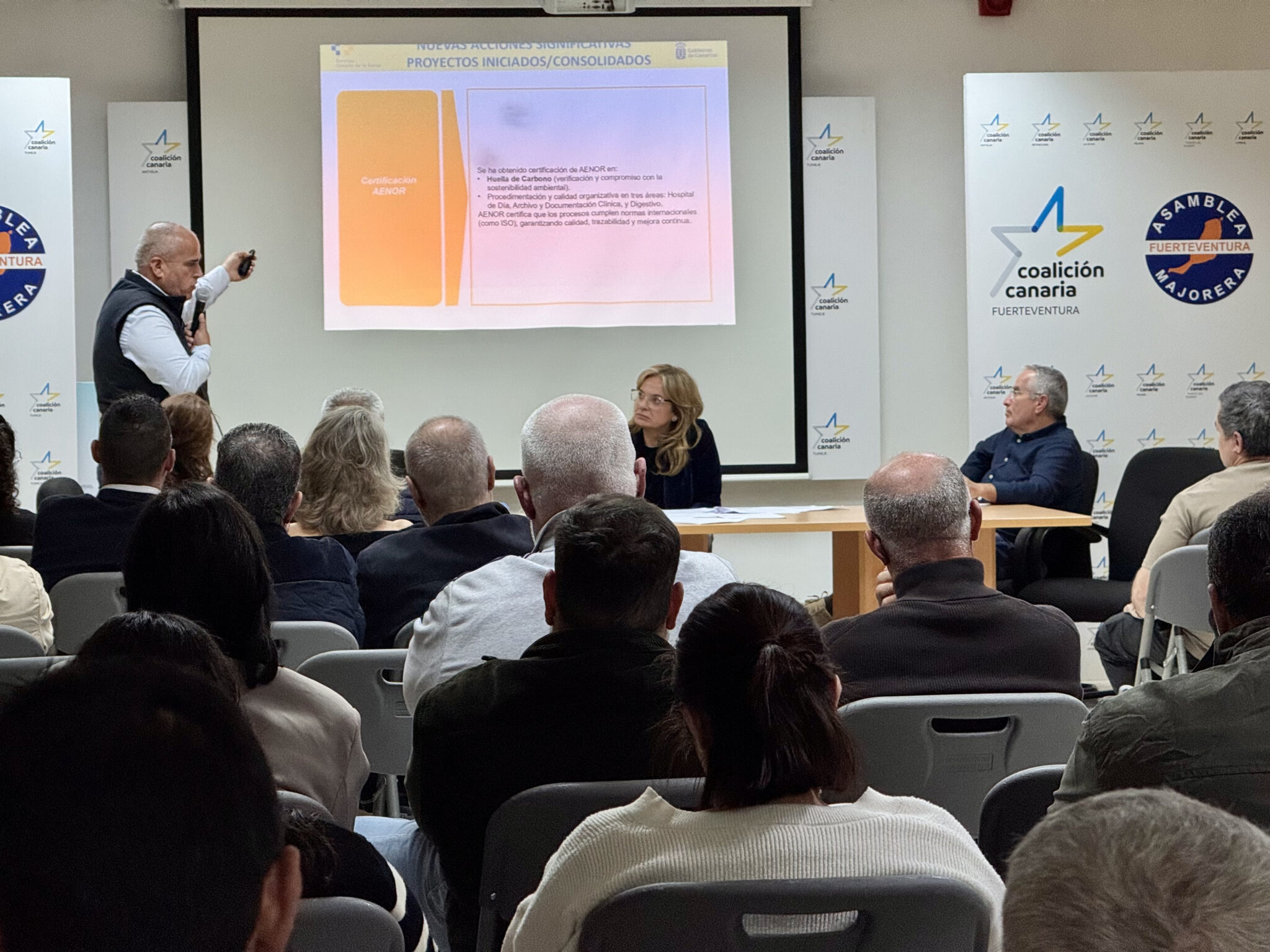 El encuentro estuvo presidido por la consejera, junto al director del Área de Salud, Tomás Pérez, quien realizó una exposición detallada de las inversiones y proyectos consignados en los presupuestos para la isla, y el secretario insular de Asamblea Majorera–Coalición Canaria, Mario Cabrera.