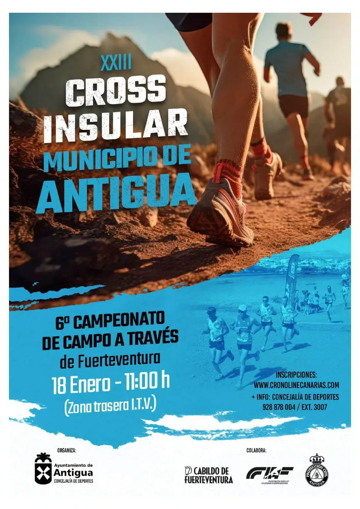 El Ayuntamiento de Antigua desde la concejalía de Deportes organiza el XXIII Cross Insular y el Sexto Campeonato Campo a Través de Fuerteventura disponiendo desde la carpa, el avituallamiento par todos los deportistas, las medallas para todas y todos los participantes y trofeos para los ganadores, así como acondicionando el terreno y un circuito en perfectas condiciones, e incluso, facilita las guaguas a las escuelas de atletismo, entre otras, las inscritas de Corralejo, Morrojable y Puerto del Rosario.