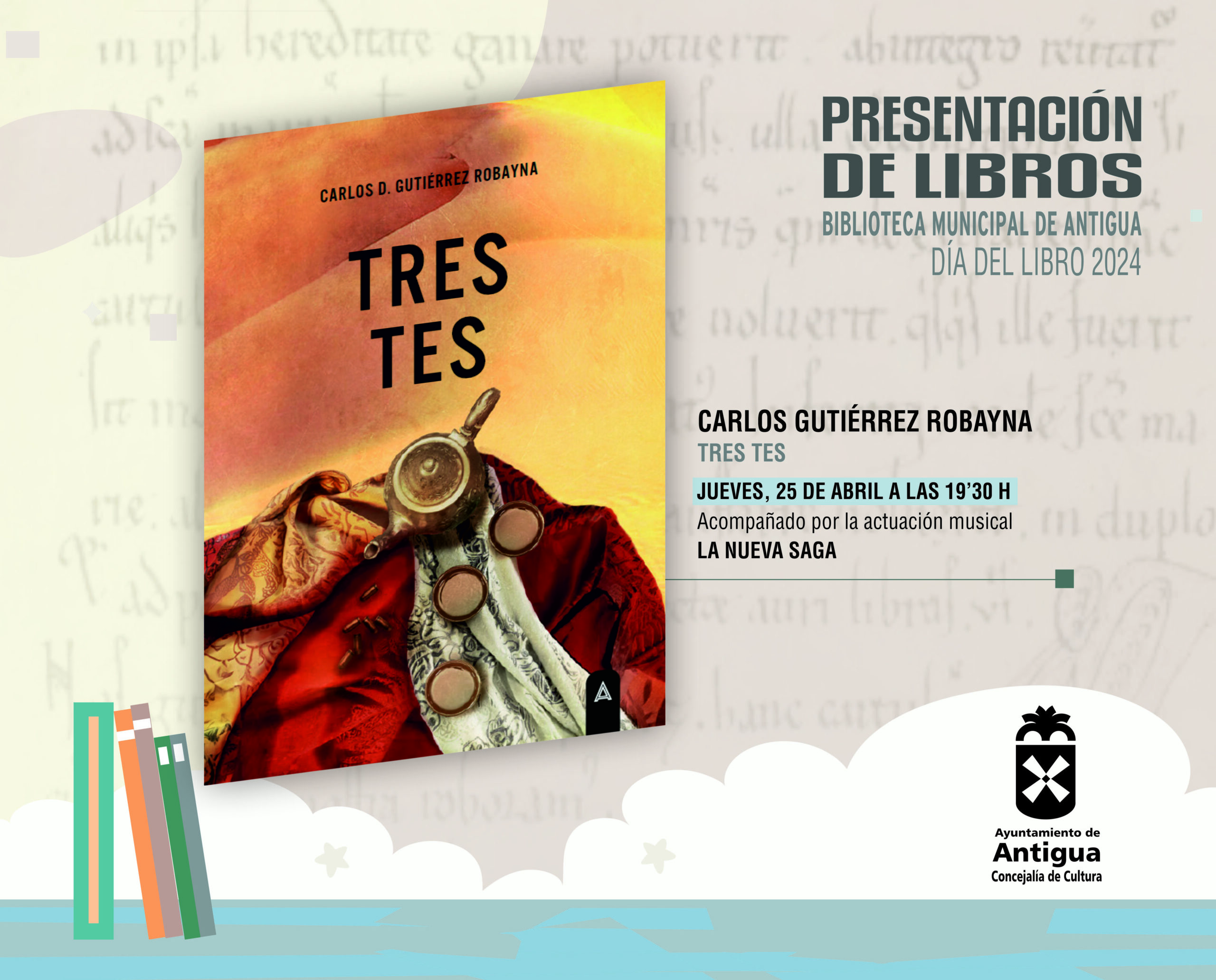Tras el cuentacuentos de Gemage, el escritor Carlos Gutiérrez Robayna presenta su última nóvela Tres Tes a las 19:30 horas, acompañado de la actuación musical de La Nueva Saga, explica el concejal. Y añade Jonathan Peña, es la mayor programación ofrecida por el Ayuntamiento de Antigua para celebrar el Día del libro cada día de este mes, con el único propósito de que la disfruten, celebrando entre todos y todas,el aumento de lectores y prestamos registrado en el último año en el Municipio de Antigua.