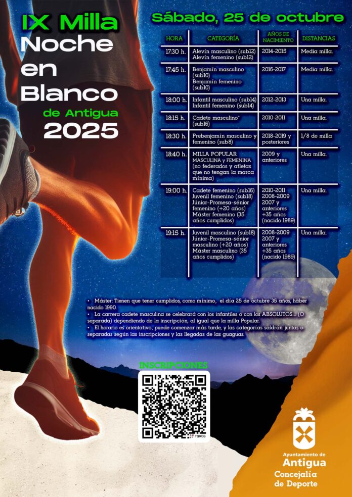 El Ayuntamiento de Antigua organiza la novena edición de la Milla Urbana Noche en Blanco, combinando deporte, fiesta y participación familiar.