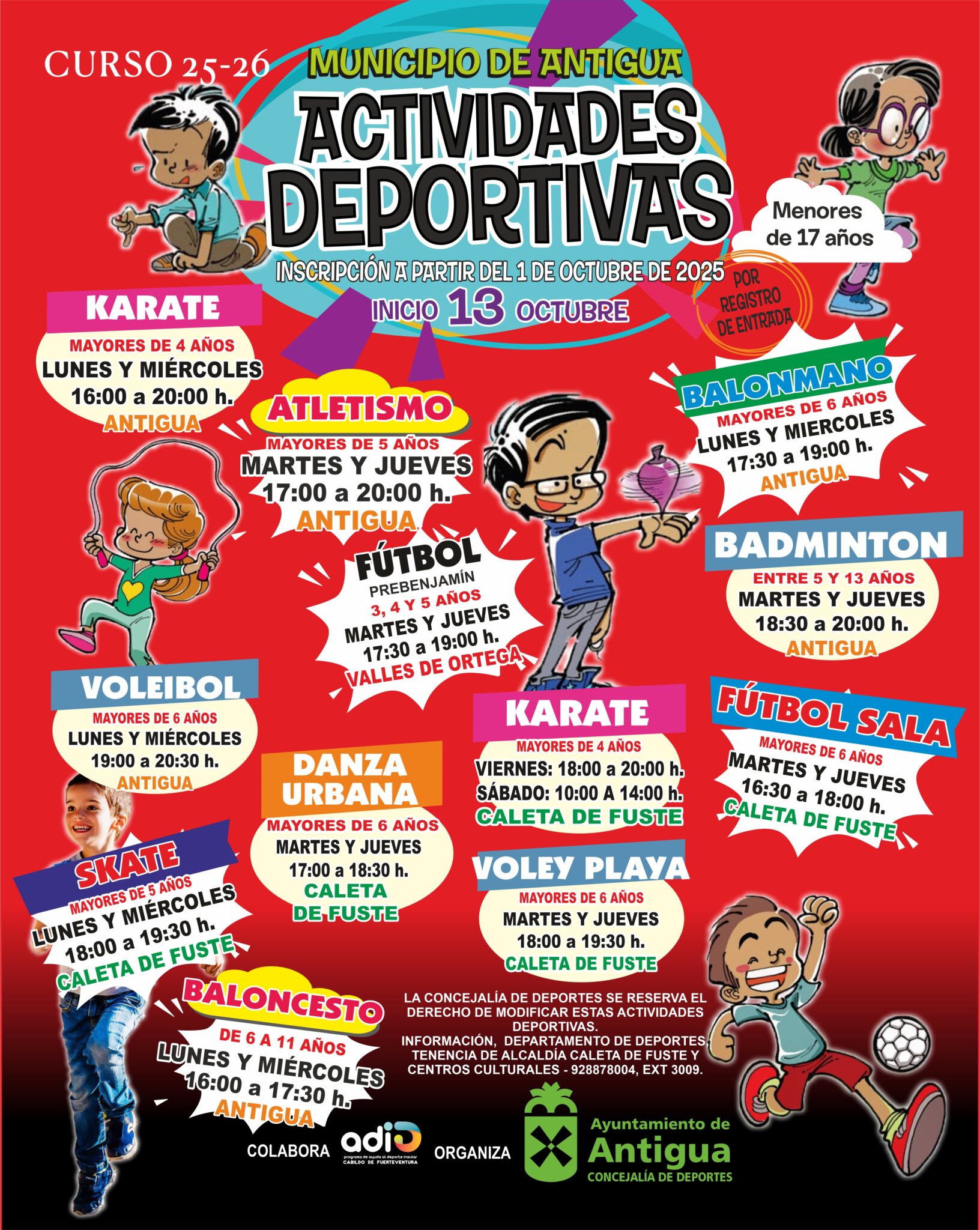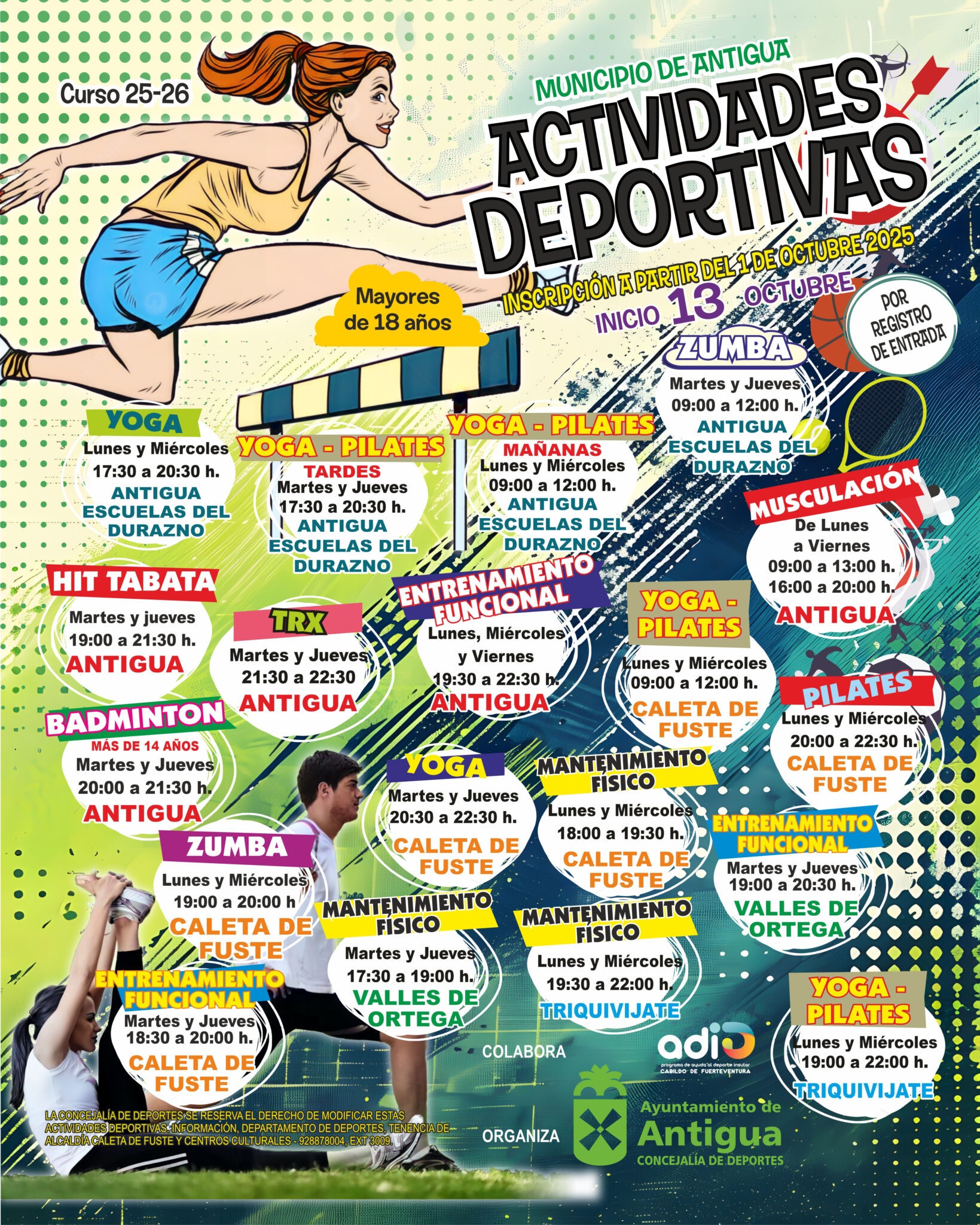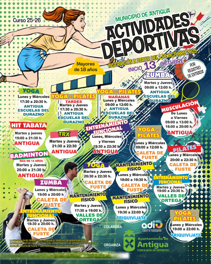 Antigua es un municipio deportivo y por lo tanto un municipio saludable, porque a la veintena de actividades ofrecidas por las escuelas infantiles y de adultos, señala el alcalde Matías Peña, se suman las actividades que ofrecen los clubs, federaciones y equipos que funcionan desde hace años con el respaldo y financiación del Ayuntamiento de Antigua, ofreciendo desde tiro con arco, ciclismo, remo, lucha canaria, actividades de mantenimiento en el centro de mayores, acrobacias o juego de palo canario, entre otras.