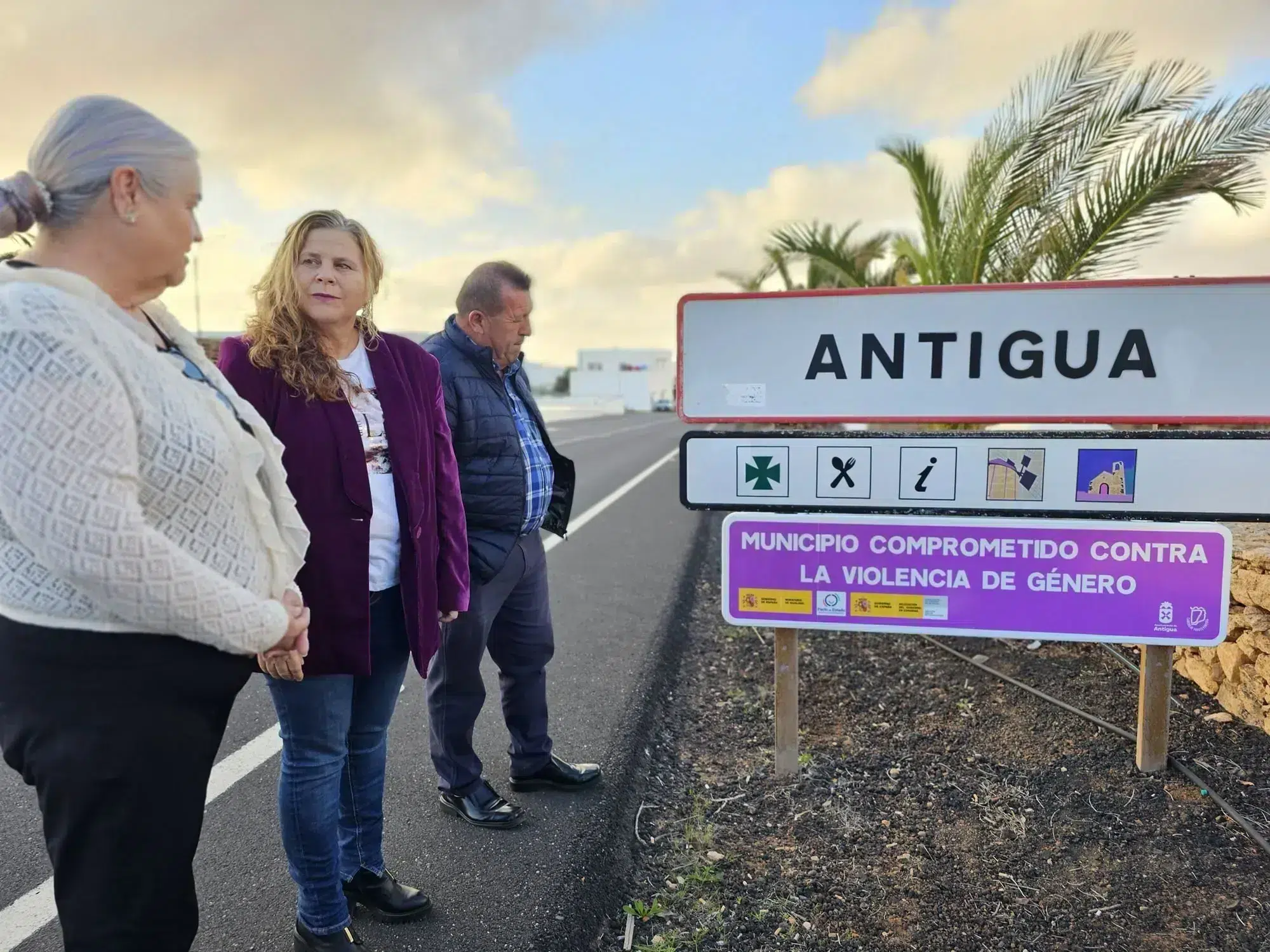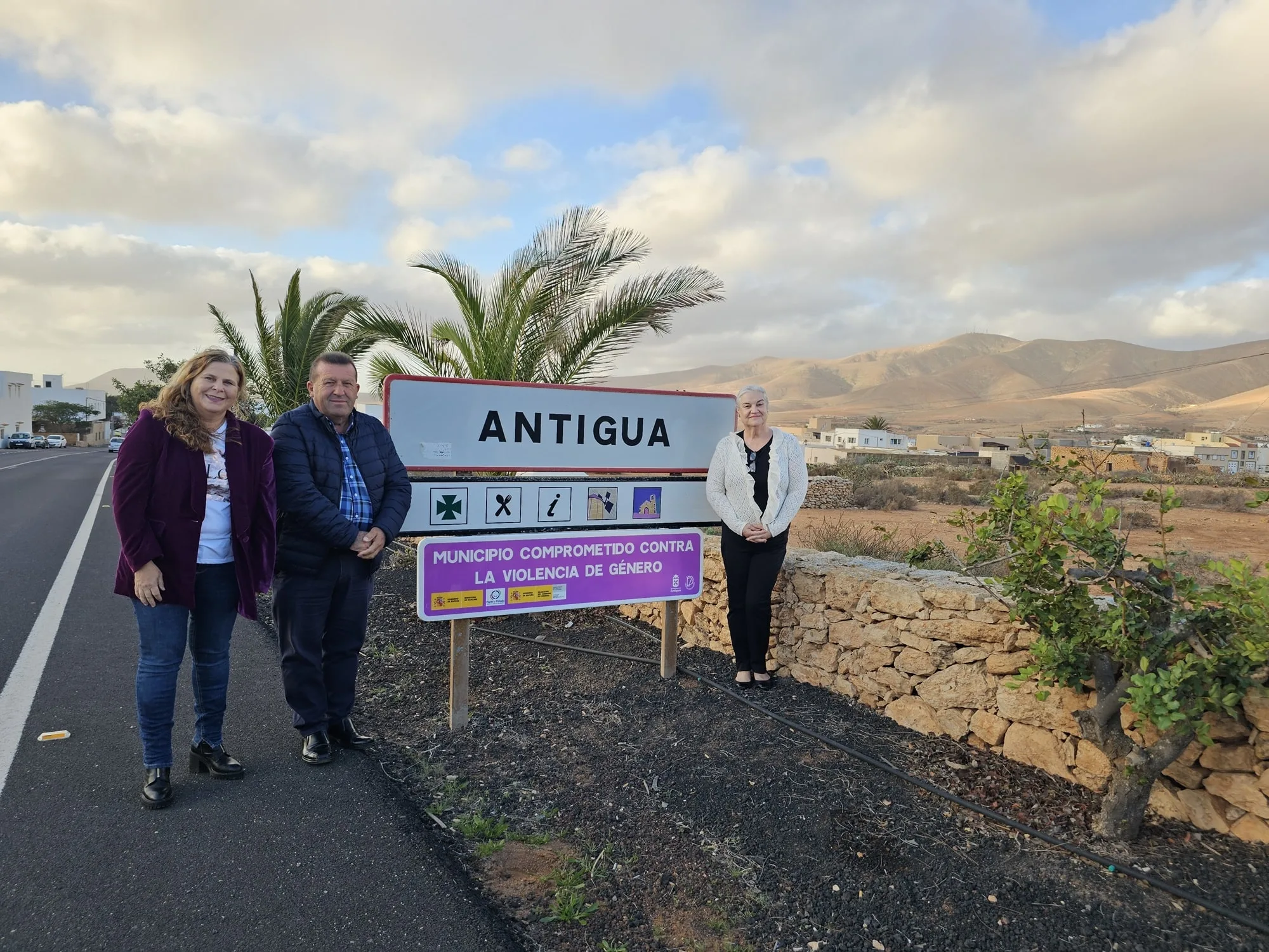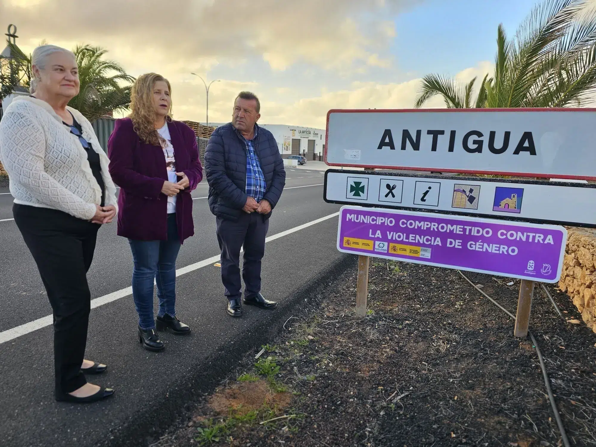 El alcalde, la Directora Insular en Fuerteventura, María Jesús de la Cruz Montserrat y la concejala de Servicios Sociales, América Soto Betancor han descubierto la señal que identifica Antigua como Municipio comprometido contra la violencia de género.