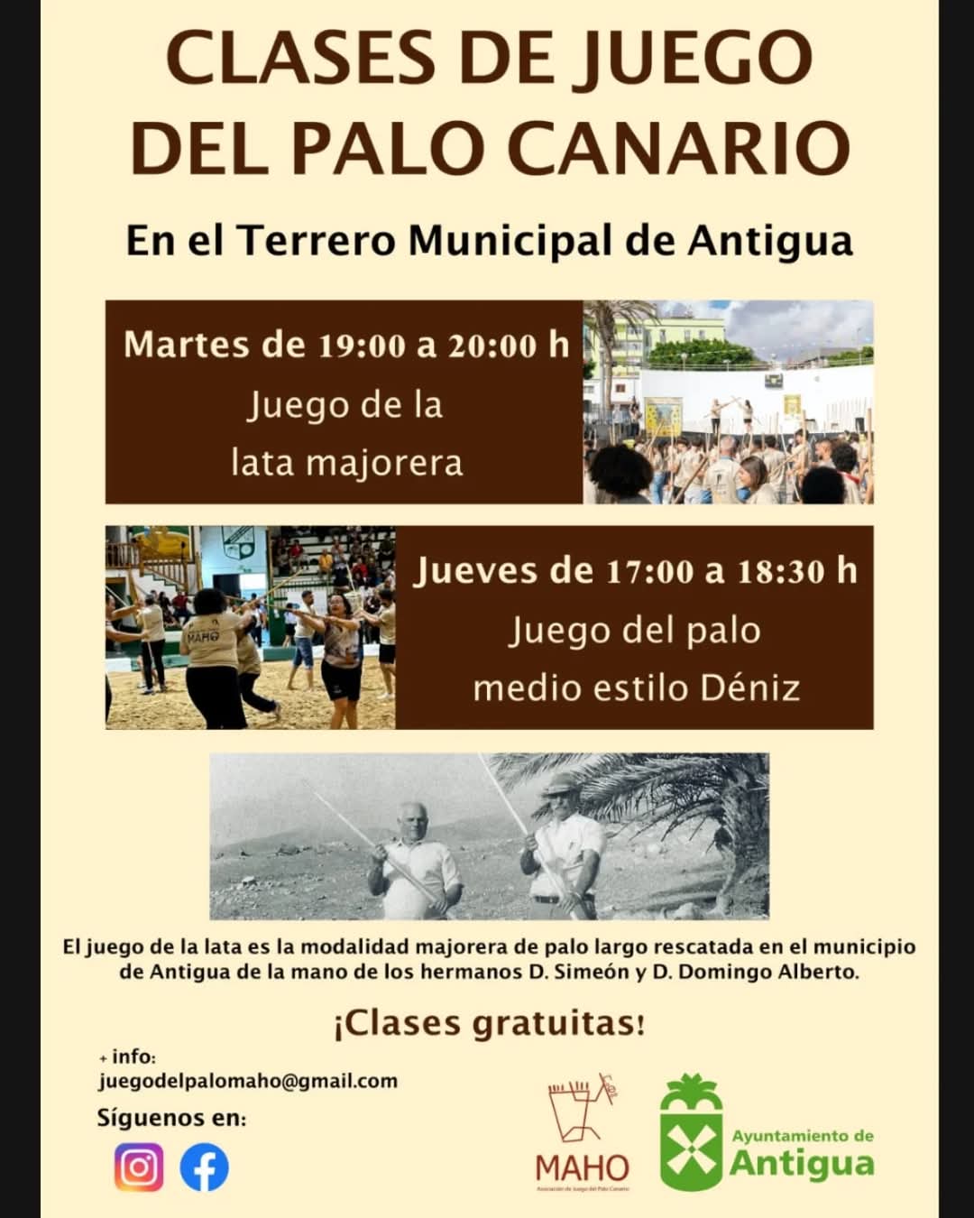 Agradecemos, en este sentido, añade el concejal de Deportes, Samuel Torres, la implicación de la Asociación Maho que ofrecen clases gratuitas los martes de 19:00 a 20:00 de Lata Majorera y los jueves de 17:00 a 18:30 horas de Palo medio.