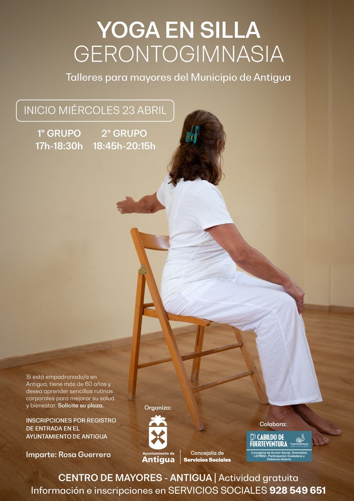 Yoga en Silla comienza a impartir sus talleres el miércoles 23 de abril por las tardes en el Centro de Mayores de Antigua, explica la concejala de Servicios Sociales, América Soto, impulsora de la organización de esta actividad dirigida a personas mayores de 60 años, preferentemente residentes en el Municipio de Antigua.