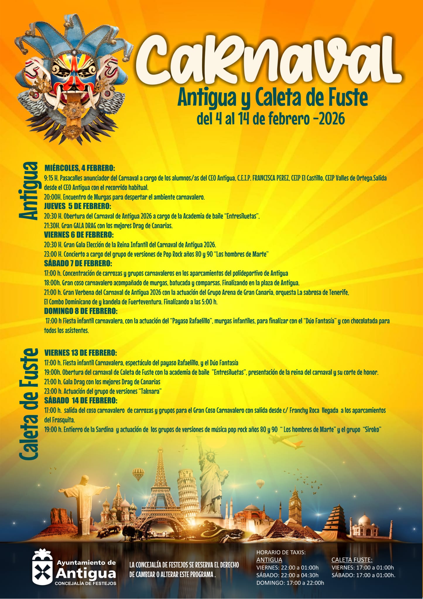 El Ayuntamiento desde la concejalía de Festejos presenta el cartel del Carnaval de Antigua y Caleta de Fuste dedicado este año a las Culturas y lugares del mundo, anuncia el alcalde, Matías Peña García, una alegoría elegida entre los grupos carnavaleros del Municipio y que permite dar rienda suelta a la imaginación, los diseños y los más creativos o coloridos disfraces.
