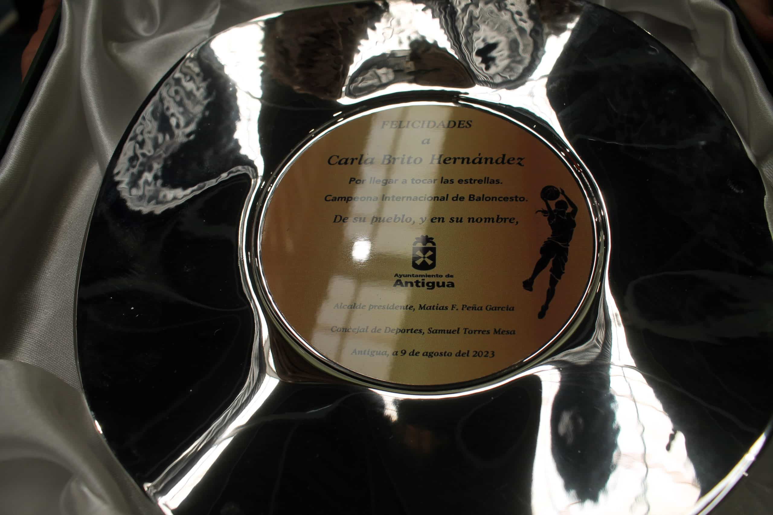 Recibida con aplausos, se le hizo entrega de un Plato Dorado en el que se podía leer: Felicidades a Cala Brito Hernández, por llegar a tocar las estrellas. De su pueblo, y en su nombre, Ayuntamiento de Antigua.