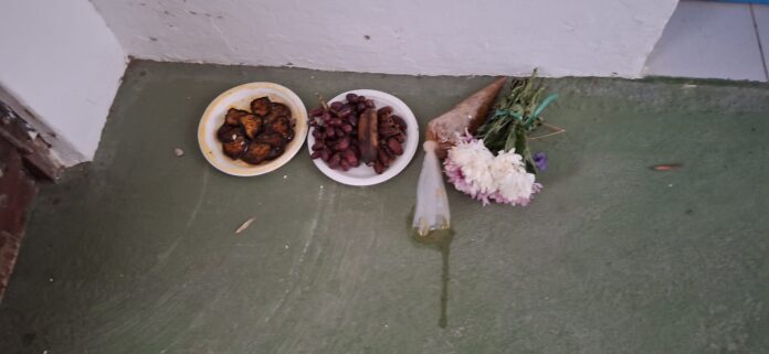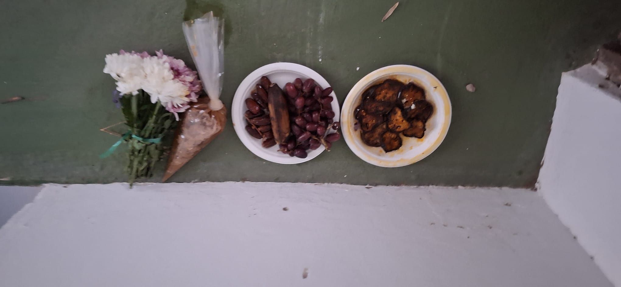 Entre los elementos observados se encuentran flores frescas, un cono de papel con lo que parece ser una mezcla ritual, frutas como uvas, dátiles, un plátano y un plato con restos de comida cocinada, posiblemente frituras. Todos estos objetos fueron cuidadosamente colocados, lo que refuerza la teoría de un acto intencionado con connotaciones esotéricas o espirituales.