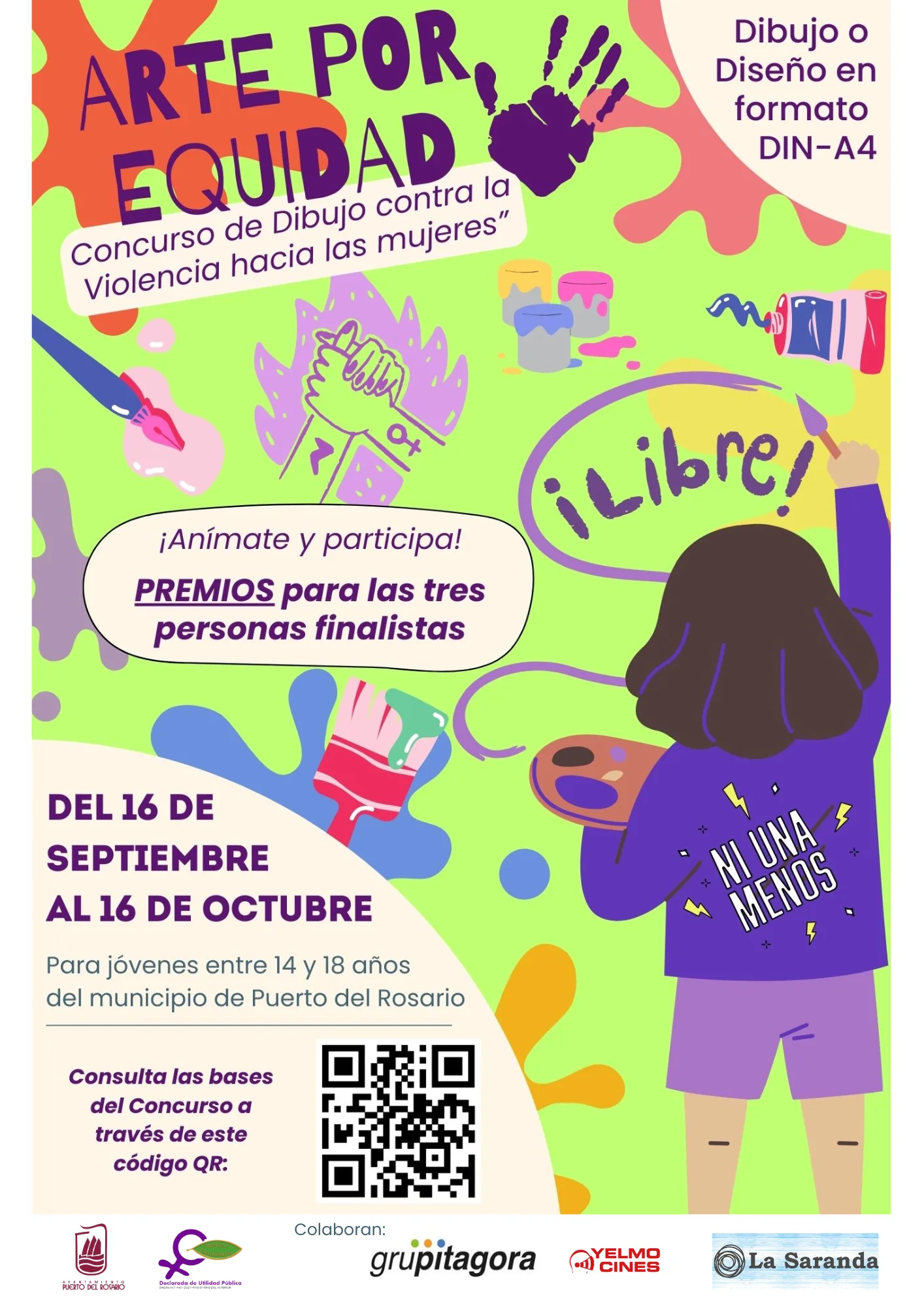 Animamos a la población joven de Puerto del Rosario a participar en dicho Concurso demostrando su talento creativo y su repulsa ante esta compleja lacra social. Los interesados en participar pueden consultar las bases completas en el QR incluido en el cartel o a través del enlace uqr.to/1v7r3.