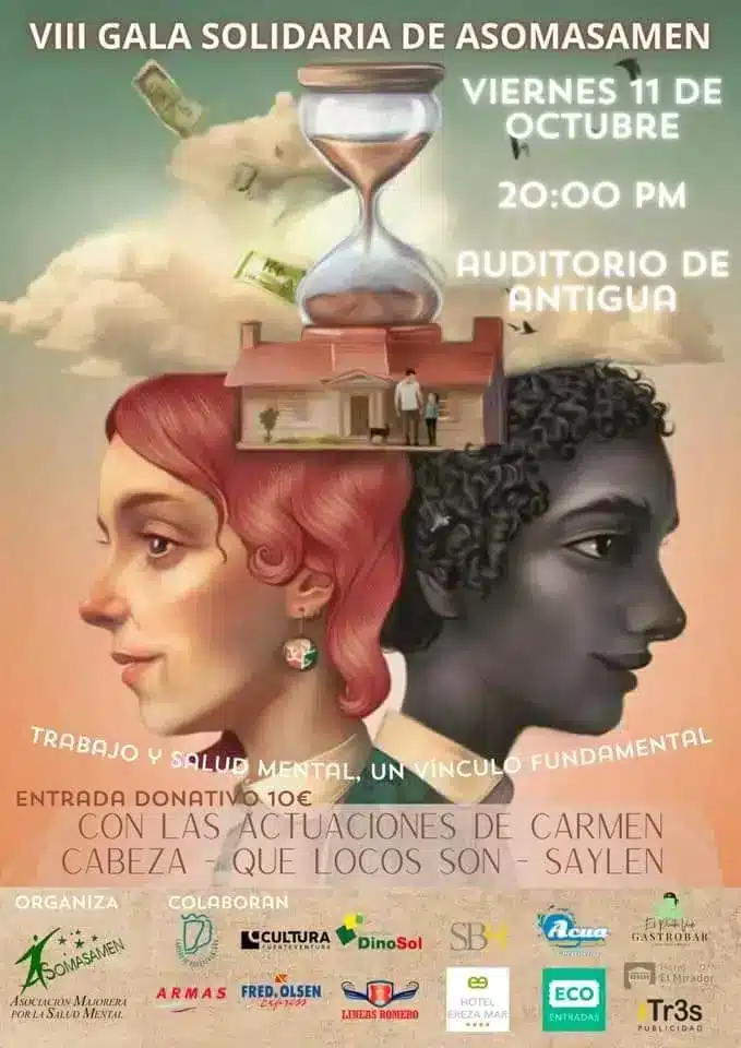 En apoyo a la salud mental, la Asociación Majorera por la Salud Mental (Asomasamen) celebrará su octava gala solidaria mañana, 11 de octubre, a las 20:00 horas, en el Auditorio de Antigua. Bajo el lema ‘Trabajo y salud mental, un vínculo fundamental’, este evento contará con la participación de destacados artistas, como la humorista Carmen Cabeza, el cantante majorero Saylen y la agrupación Que locos son.