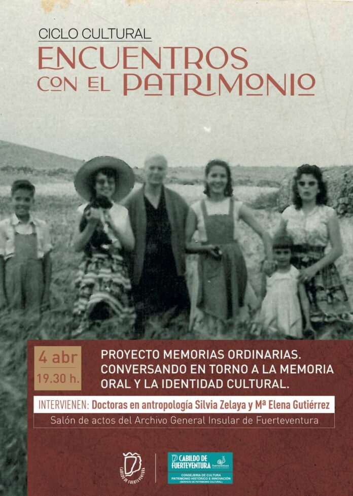 Patrimonio Cultural del Cabildo de Fuerteventura, que dirige Rayco León, pone en marcha el Ciclo ‘Encuentros con el Patrimonio’, con el objetivo de debatir, de un modo cercano y participativo, sobre distintos aspectos del patrimonio insular. La programación arranca este jueves, 4 de abril, a las 19.30 horas, con un encuentro con las doctoras en antropología Silvia Zelaya y María Elena Gutiérrez Lima, en torno al proyecto Memorias Ordinarias. Una iniciativa que busca reconstruir la identidad cultural a través de la memoria oral.