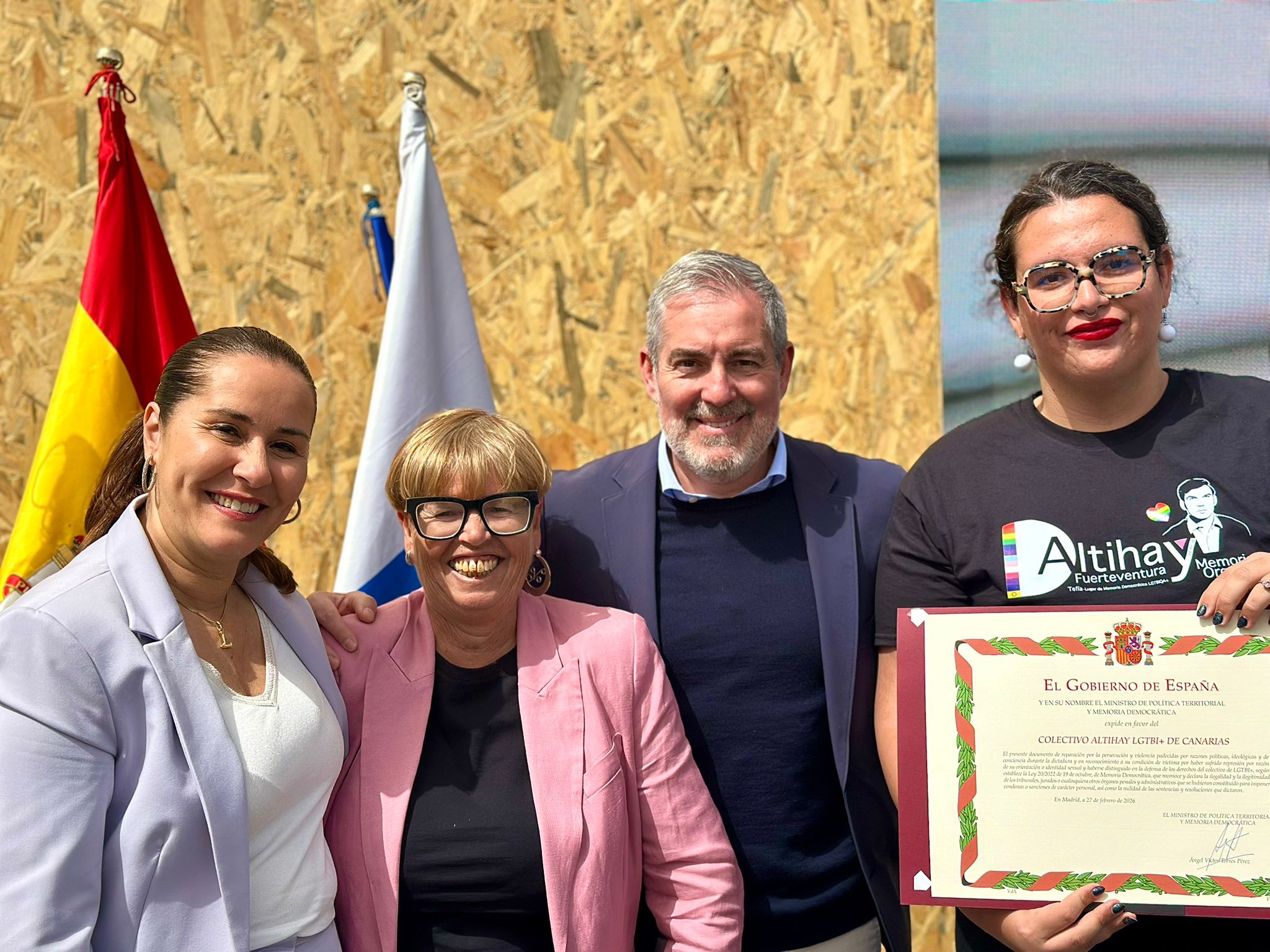 Durante el acto, el ministro de Política Territorial y Memoria Democrática, Ángel Víctor Torres, señaló que “hoy asistimos a un hermoso acto de justicia en Fuerteventura, honrando a nueve personas de Canarias y del País que han sufrido persecución, así como al colectivo ALTIHAY, que están siendo reconocidas con toda su dignidad”. “Gracias por ser un ejemplo, porque la democracia se construye con verdad”.