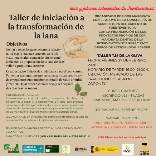 Este taller está dirigido a todas las edades y será impartido por Beatriz Ballester Morón, artesana herreña de hilado de lana. Las sesiones tendrán lugar en Tuineje el 26 de febrero y La Oliva el 27 de febrero en horario de tarde, y en Puerto del Rosario el 28 de febrero en horario de mañana. Las inscripciones y toda la información pueden consultarse en gdrmaxoratacursos@gmail.com o a través del WhatsApp al teléfono 633 09 39 03.