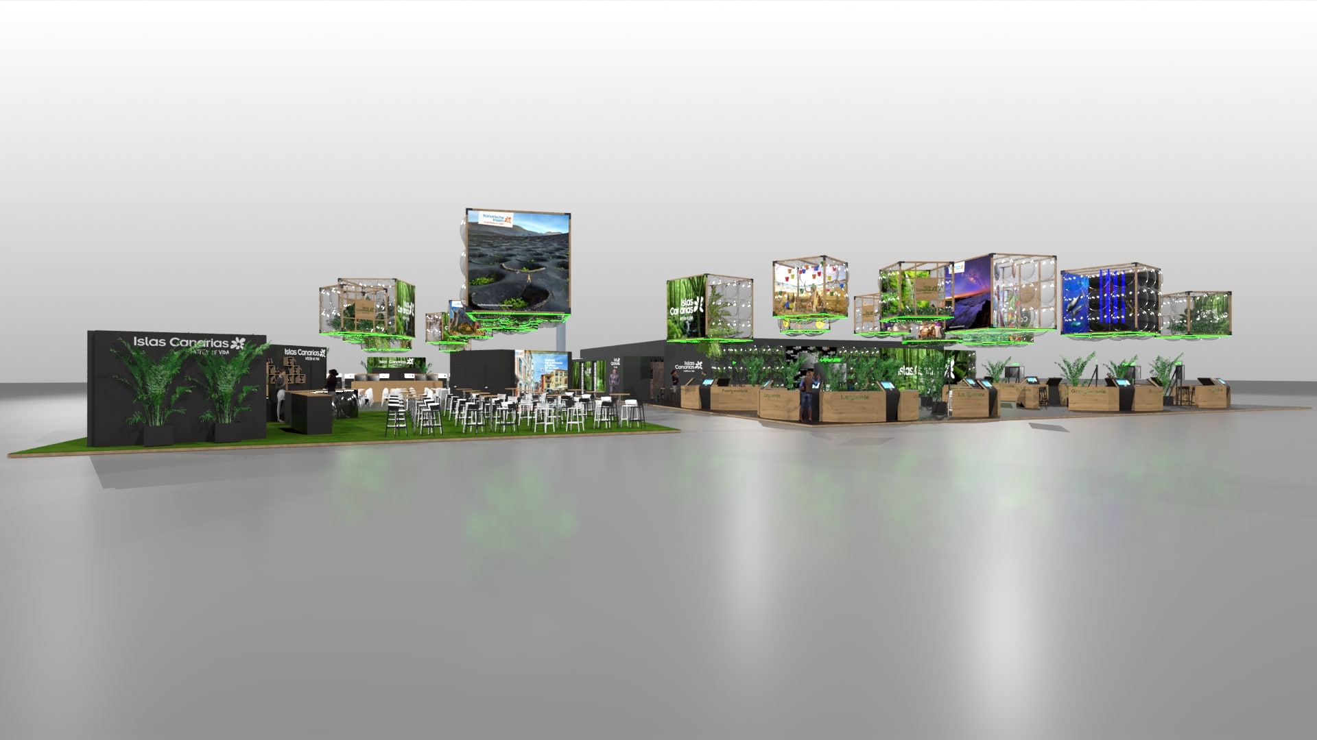 El stand vuelve a caracterizarse por desplegar un importante potencial comunicacional, alta calidad de diseño y un enfoque innovador, además de contar con varios reclamos visuales para generar notoriedad. El principal de estos reclamos son los 20 escaparates aéreos en forma de cubos transparentes, de gran impacto visual, que funcionarán como enormes escaparates de la oferta turística canaria y donde se proyectarán imágenes audiovisuales de las ocho islas, así como de cuatro segmentos: sol y playa, activo y de naturaleza, de cultura y patrimonio y gastronómico.