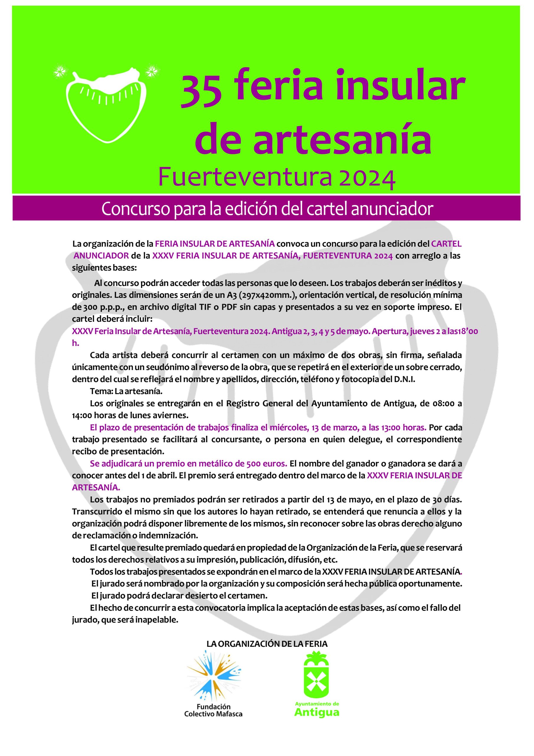 La presidenta del Fundación Mafasca, Nereida Brito, recuerda que el cartel debe incluir, XXXV Feria Insular de Artesanía, Fuerteventura 2024. Antigua 2, 3, 4 y 5 de mayo. Apertura, jueves 2 a las 18’00 h.