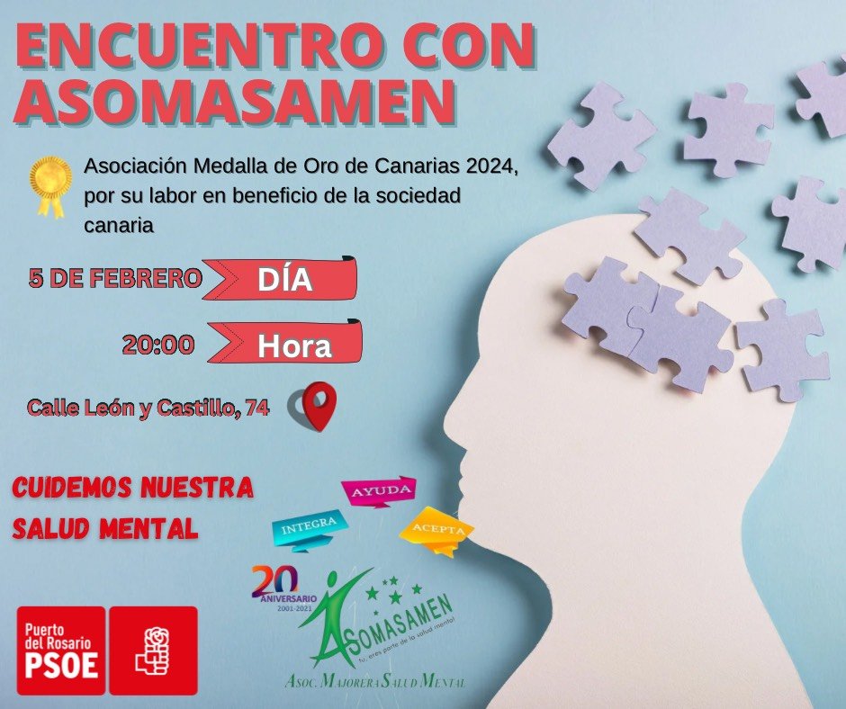 Este miércoles, 5 de febrero, a las 20:00 horas, la Asociación Majorera por la Salud Mental (ASOMASAMEN) en colaboración con el PSOE de Puerto del Rosario mantendrán un encuentro abierto con la ciudadanía en su sede, situada en Calle León y Castillo, 74, con el objetivo de conocer de cerca los proyectos y acciones que desarrolla la entidad en favor de la salud mental en Fuerteventura.
