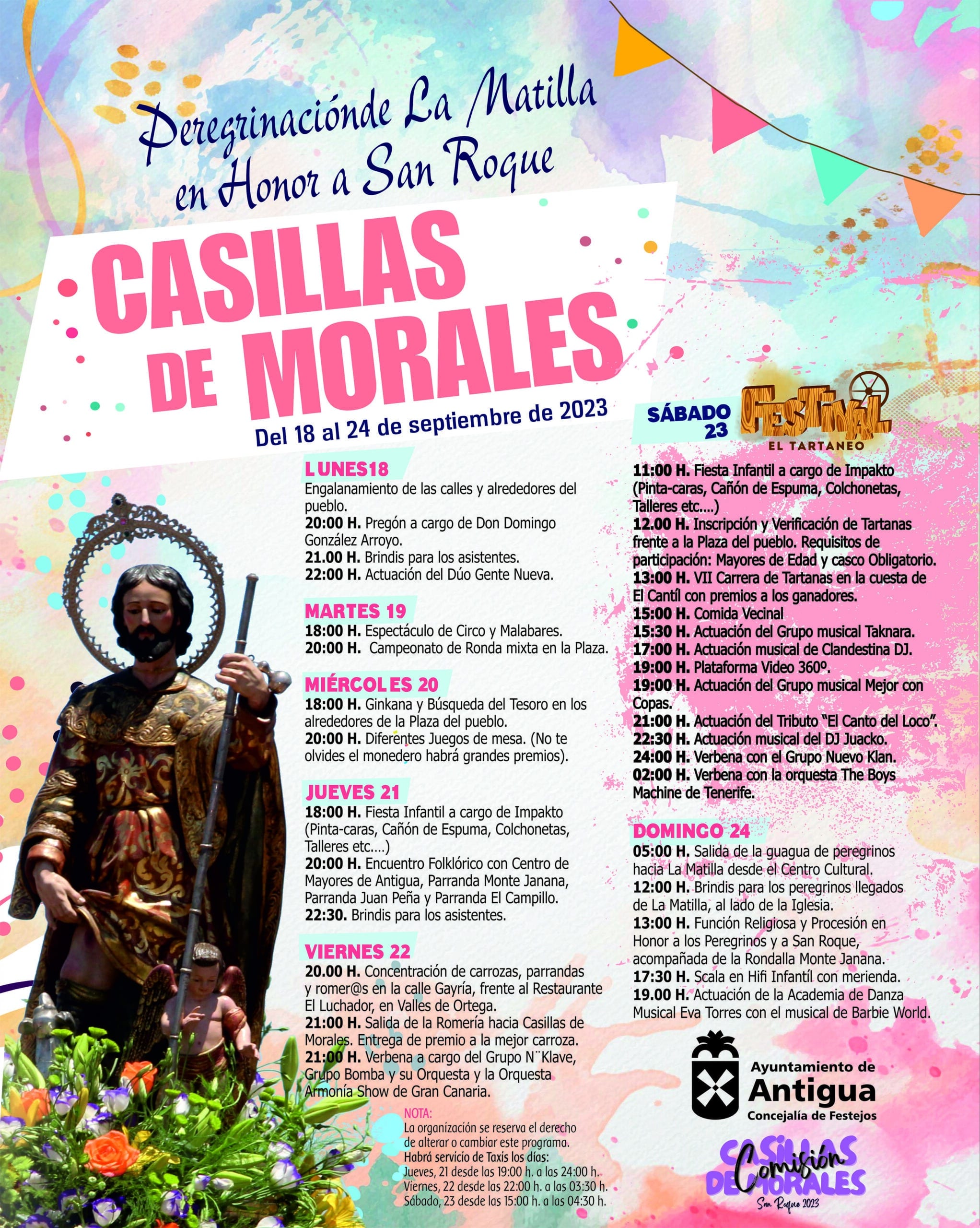 Un programa de festejos propuesto por la Comisión de Fiestas de San Roque, organizando conjuntamente con el Ayuntamiento de Antigua cada acto, evento y concierto, señala el alcalde Matías Peña.