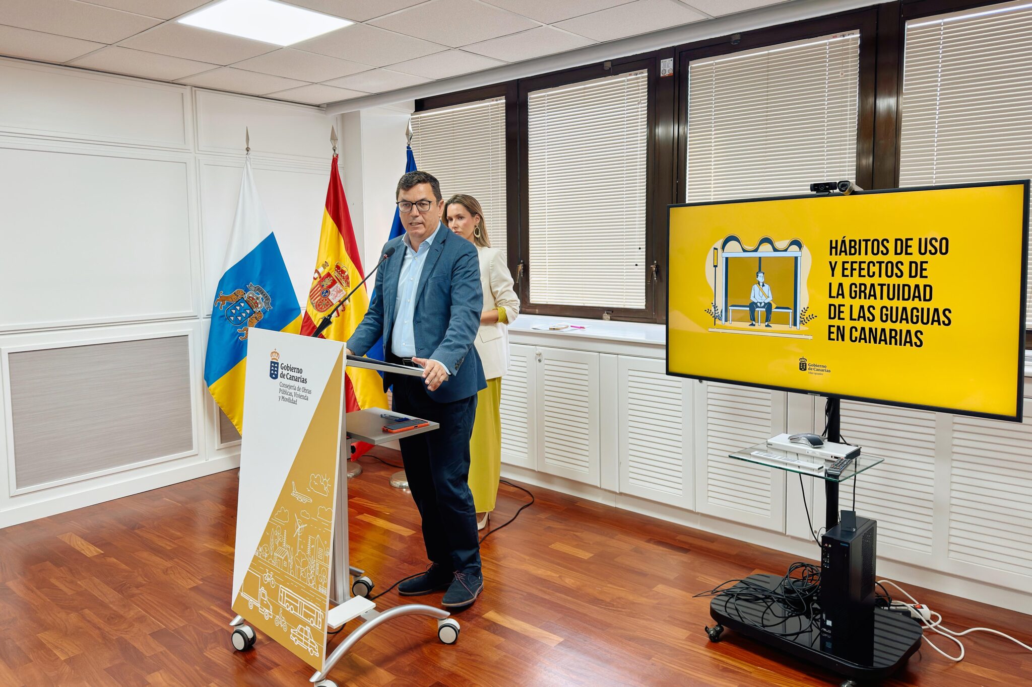 El consejero de Obras Públicas, Vivienda y Movilidad del Gobierno de Canarias, Pablo Rodríguez, junto con la directora general de Transportes y Movilidad, María Fernández, han presentado los datos de un informe encargado por la Consejería que evidencia que el 30,3% de los usuarios del Bono Residente Canario ha dejado el coche y ha incorporado el uso del transporte público en su rutina diaria, lo que confirma un cambio de tendencia en la movilidad de las islas.