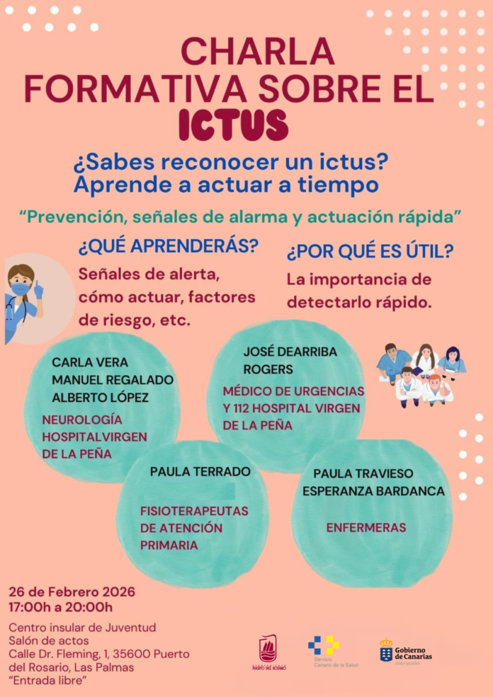 El departamento de Formación de la Gerencia de Servicios Sanitarios de Fuerteventura, adscrita a la Consejería de Sanidad del Gobierno de Canarias, colabora en la impartición de una charla formativa sobre prevención y detección precoz del ictus dirigida a la población general. La sesión se celebrará el próximo 26 de febrero, de 17:00 a 20:00 horas, en el salón de actos del Centro Insular de la Juventud de Puerto del Rosario.