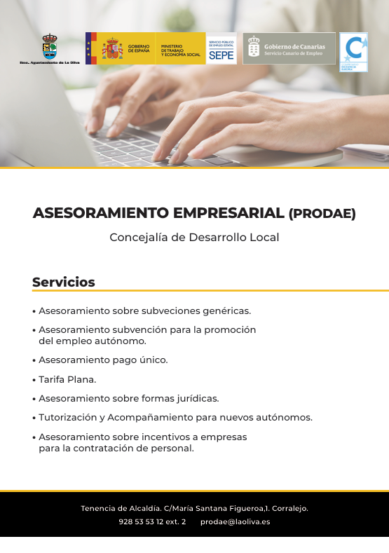 El Ayuntamiento de La Oliva, a través de la Concejalía de Desarrollo Local, que dirige Alexandra Martín, anuncia la continuidad durante el año 2026 del Servicio de Promoción del Desarrollo de la Actividad Económica (PRODAE 2026), programa que ya se está ejecutando.