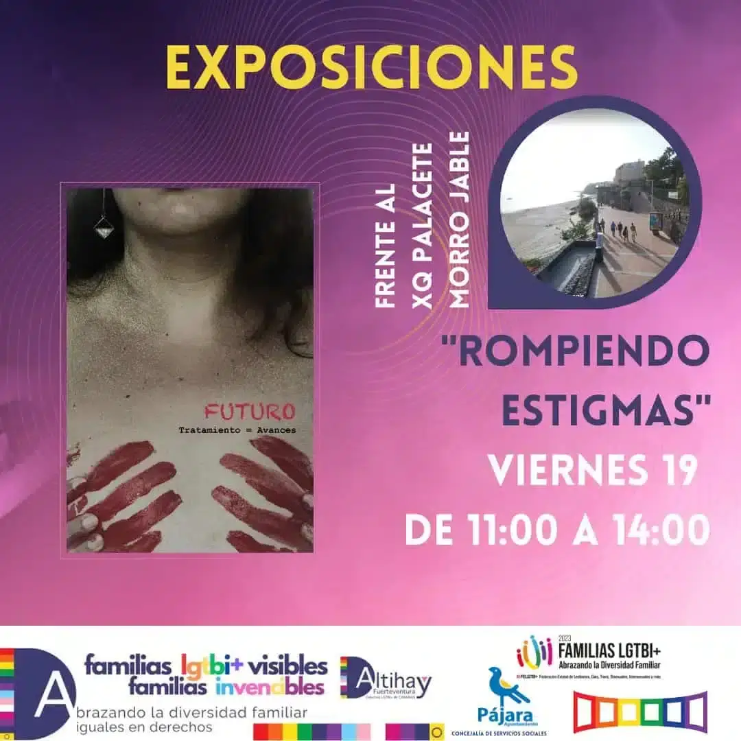 Este viernes, 19 de mayo, a las 11:00 horas, se inaugurará la exposición ‘Rompiendo Estigmas’, ubicada frente al ‘XQ Palacete’ de Morro Jable. A partir de la misma hora, se llevará a cabo la actividad ‘Alegando de sexualidad’, un espacio dedicado al debate acerca de la salud sexual y otros asuntos relacionados. De 17:30 a 21:00 horas habrá un stand informativo con todo lo relacionado acerca de estos proyectos en la Plaza de los Pescadores.