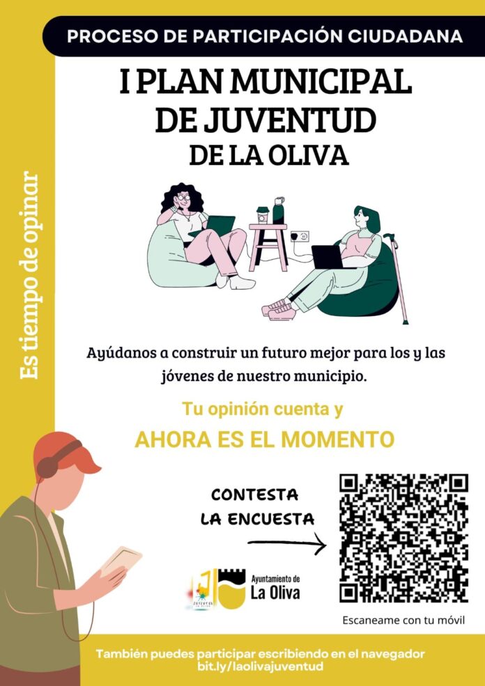 El Ayuntamiento de La Oliva hace un llamado a la ciudadanía para que participe activamente en el proceso de construcción del primer Plan Municipal de Juventud a través de una encuesta disponible en este enlace: bit.ly/laolivajuventud<bit.ly/laolivajuventud>. La Concejalía de Juventud, a cargo de Gleiber Carreño, lidera esta iniciativa que busca comprender las necesidades específicas de los jóvenes del municipio, marcando así un hito en el compromiso institucional con las generaciones venideras.