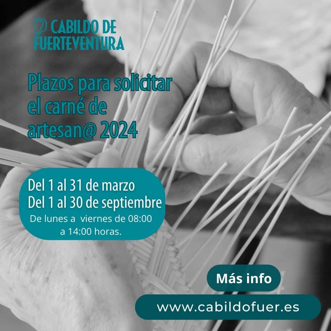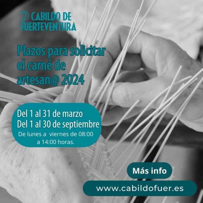 El Cabildo de Fuerteventura anuncia la apertura oficial de la convocatoria para la solicitud del carnet de artesano en el año 2024. Los interesados podrán presentar su solicitud en el Registro General de la Corporación, en las Oficinas de Atención Ciudadana o de manera telemática a través de la página web del Cabildo, durante dos períodos: del 1 al 31 de marzo y del 1 al 30 de septiembre, en días laborables, en horario de 8:00 a 14:00 horas.