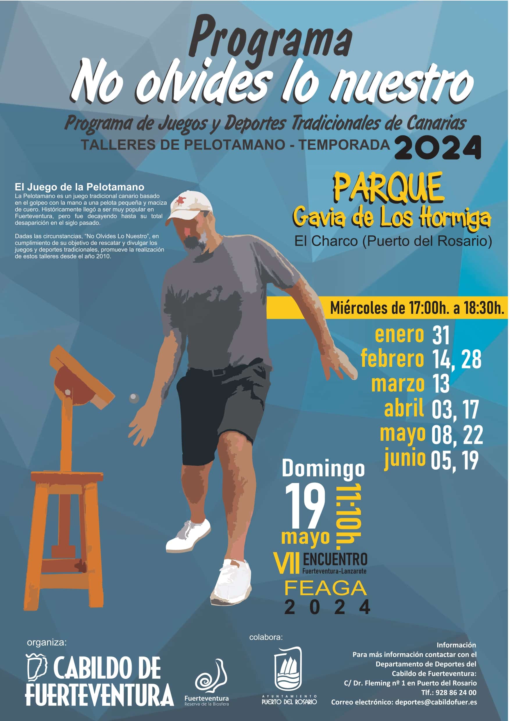 La Consejería de Deportes del Cabildo de Fuerteventura inicia el próximo miércoles, 31 de enero, la temporada 2024 de los talleres del juego canario de pelotamano, que se enmarcan dentro del programa de recuperación, conservación y difusión de nuestros juegos y deportes tradicionales No olvides lo nuestro, que comenzó en el año 2010.
