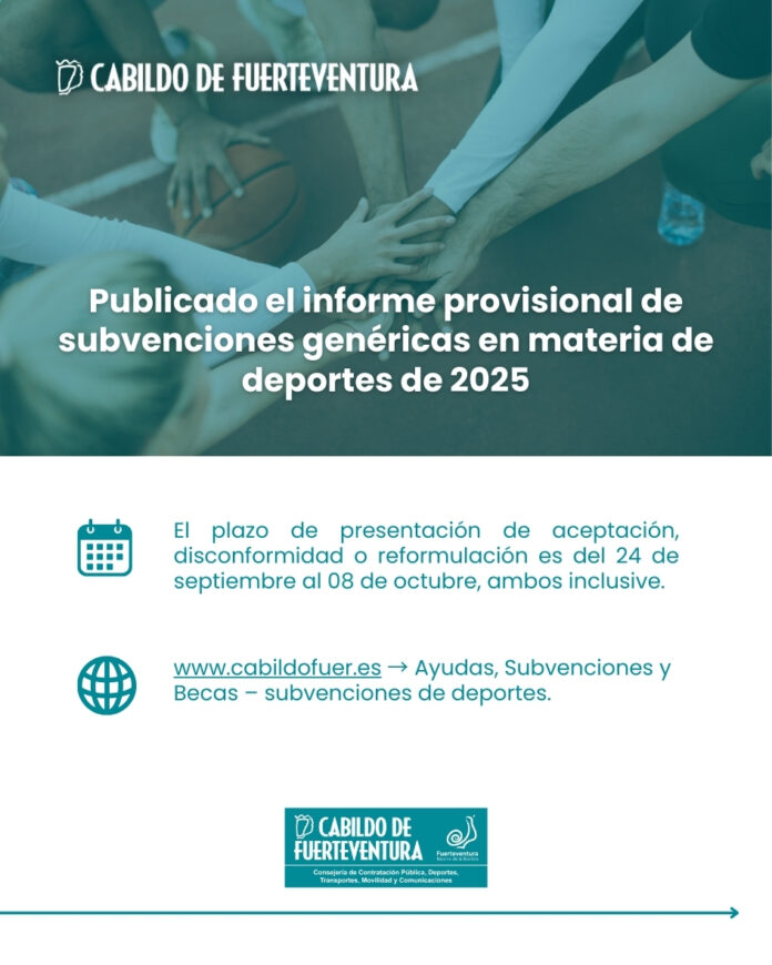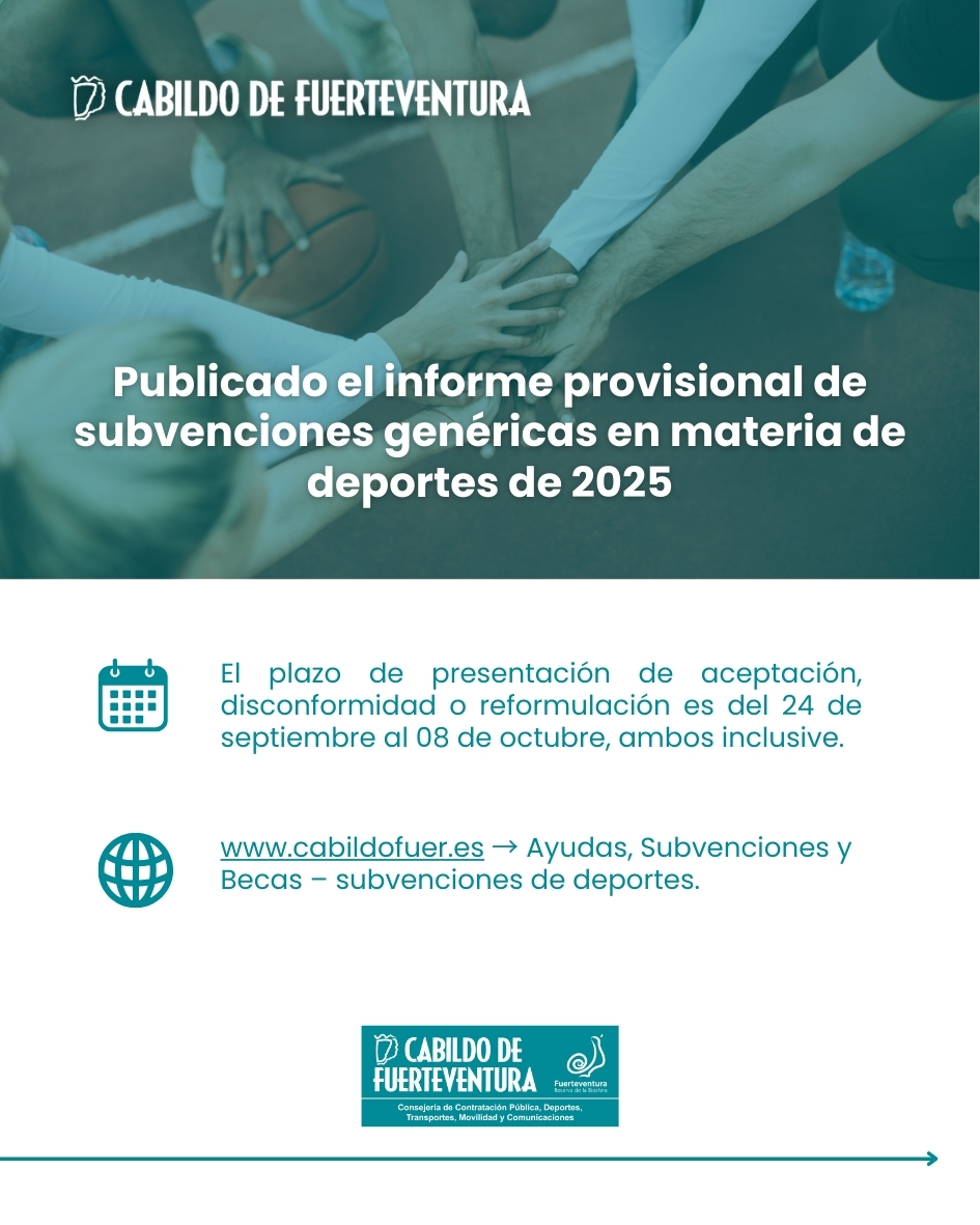 La Consejería de Deportes, que dirige Luis González, comunica que está publicado el informe provisional con las subvenciones en materia deportiva, de la presente anualidad, a disposición de cualquier persona interesada, siendo el plazo de presentación de documentación desde hoy miércoles, 24 de septiembre, hasta el próximo miércoles, 08 de octubre.