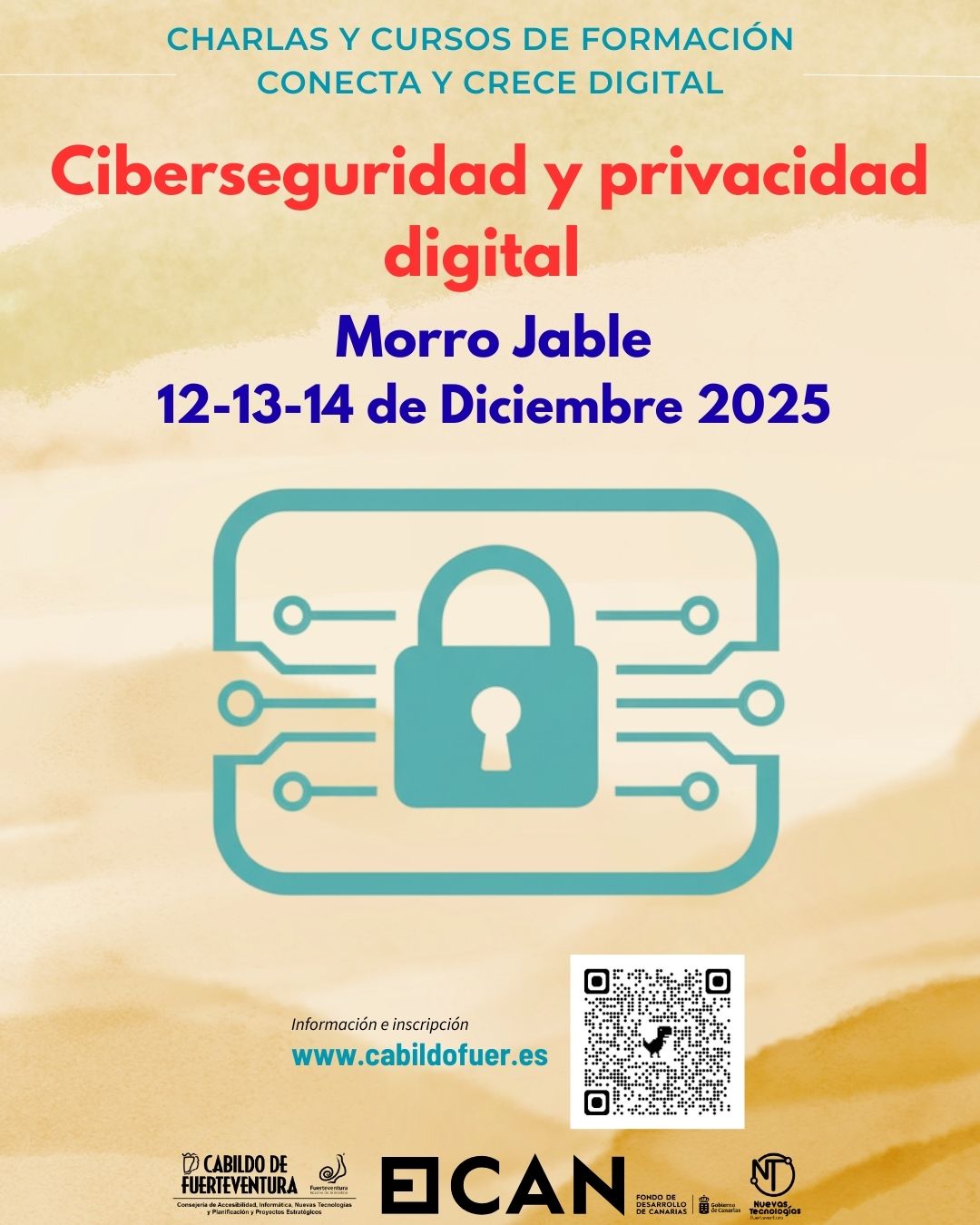 El Cabildo de Fuerteventura, a través de la Consejería de Informática y Nuevas Tecnologías, impulsa un nuevo curso formativo gratuito sobre “Ciberseguridad y privacidad digital”, dentro del programa “Charlas y Cursos de Formación Conecta y Crece Digital”, orientado a reducir la brecha digital y favorecer un uso seguro y responsable de la tecnología.