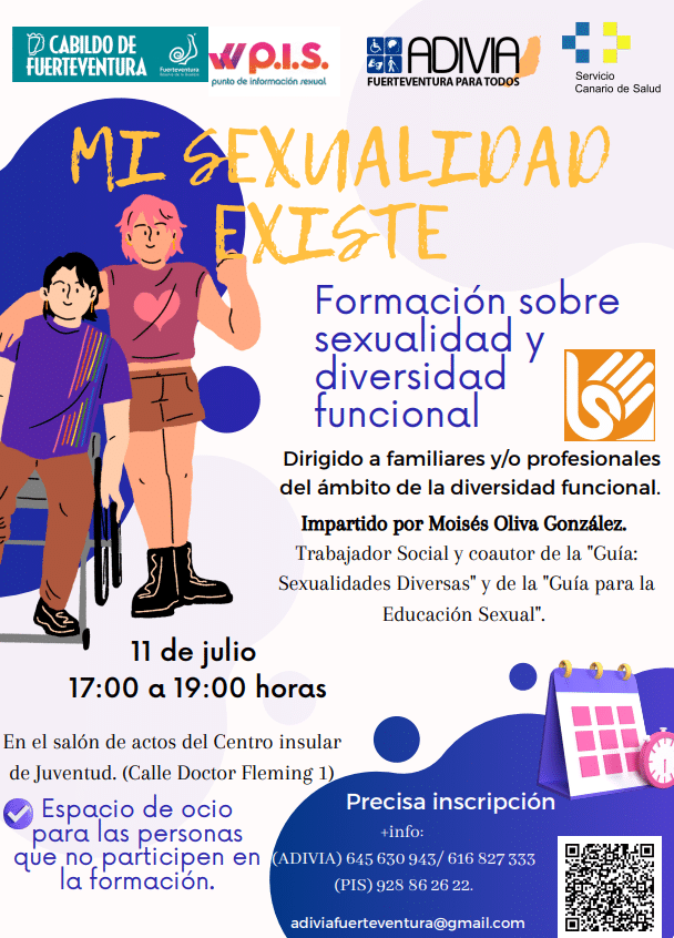 El Cabildo de Fuerteventura, a través del área de Acción Social, que dirige Víctor Alonso, imparte mañana una acción formativa sobre sexualidad y diversidad funcional. Bajo el título ‘Mi sexualidad existe’, esta actividad se lleva a cabo, a través del Punto de Información Sexual, junto con el área de Discapacidad. La iniciativa, impartida por Moisés Oliva, tendrá lugar el 11 de julio, de 17:00 a 19:00, en el salón de actos del Centro insular de Juventud.