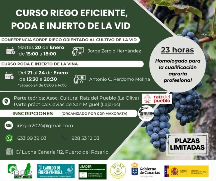 La formación contará con una duración total de 23 horas y está homologada para la cualificación agraria profesional. La parte teórica se desarrollará en la Asociación Cultural Raíz del Pueblo, en La Oliva, mientras que la parte práctica se realizará en las gavias de San Miguel, en Lajares.