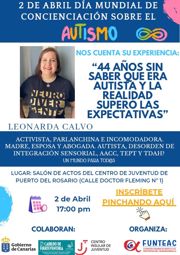El Centro Insular de Juventud acoge el próximo martes, 2 de abril, una actividad organizada por la Fundación Canaria de Apoyo a los Trastornos del Neurodesarrollo (FUNTEAC), en el marco del Día Mundial de Concienciación del Autismo. La actividad consistirá en una charla a cargo de Leonarda Calvo, abogada y activista de los derechos de las personas con discapacidad intelectual y del desarrollo.
