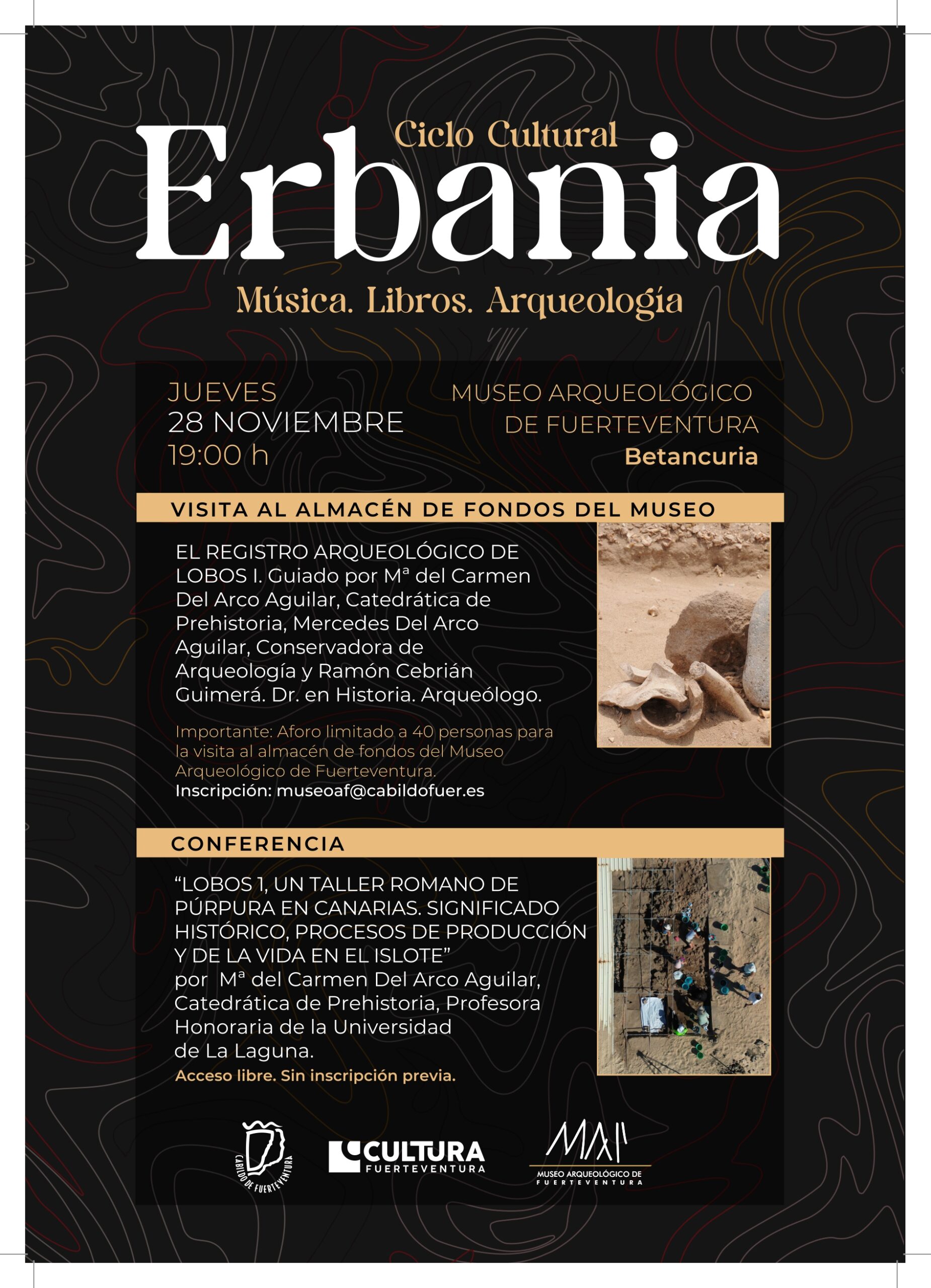 El Cabildo de Fuerteventura despide mañana, jueves 28 de noviembre, el ciclo cultural Erbania con dos actividades que pondrán broche final a esta exitosa propuesta de difusión del patrimonio arqueológico majorero. A lo largo de sus sesiones, el ciclo ha ofrecido visitas guiadas al almacén de fondos del Museo Arqueológico de Fuerteventura (MAF), charlas especializadas y eventos culturales que han permitido a la ciudadanía conectar con el legado histórico de la Isla.