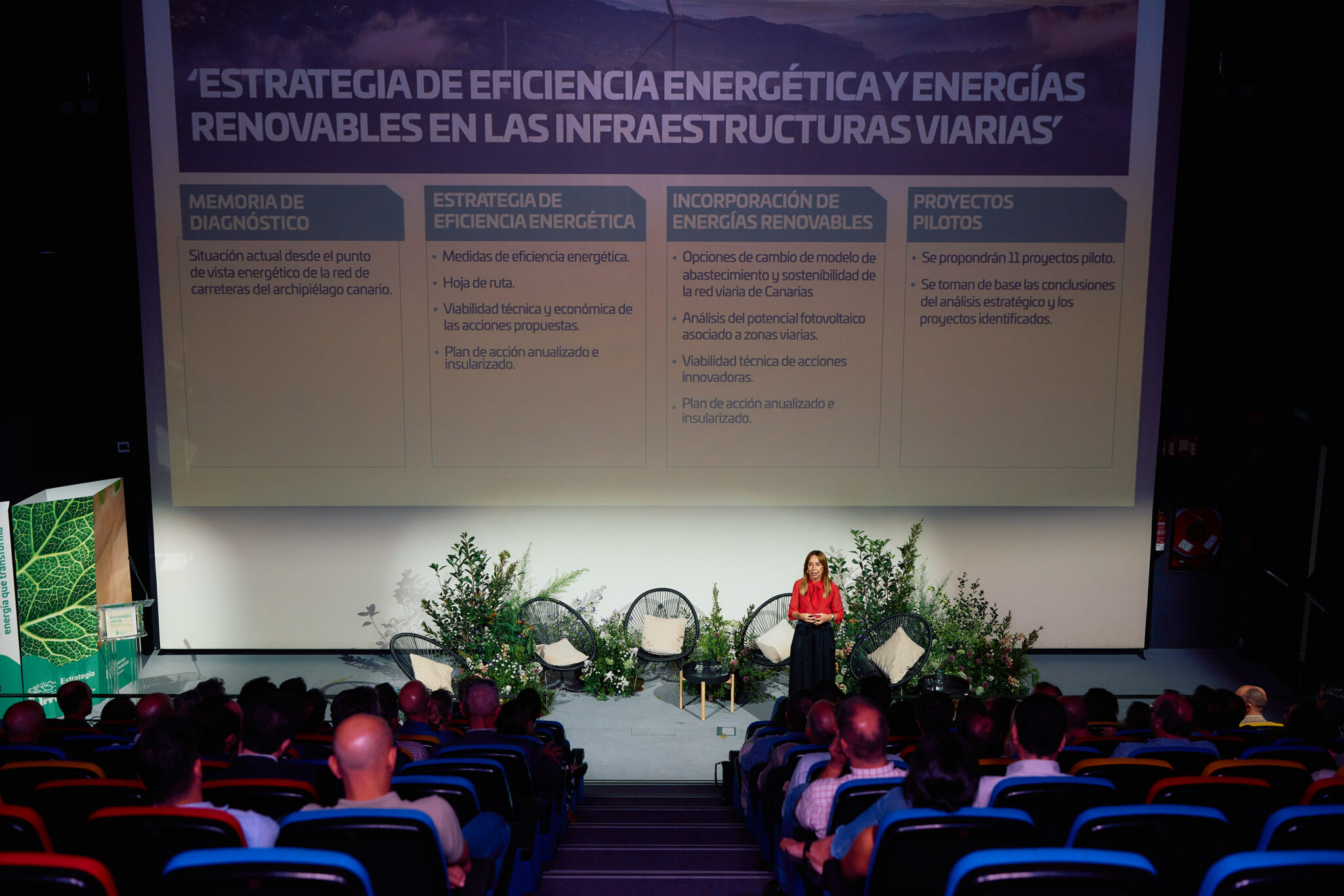 Por su parte, la directora general de Infraestructura Viaria, Rosana Melián ha explicado que la Estrategia Verde se ha estructurado en cuatro grandes documentos: un diagnóstico energético de la red, una Estrategia de Eficiencia Energética, una Estrategia para la incorporación de Energías Renovables, y una propuesta de proyectos piloto para su implantación progresiva.