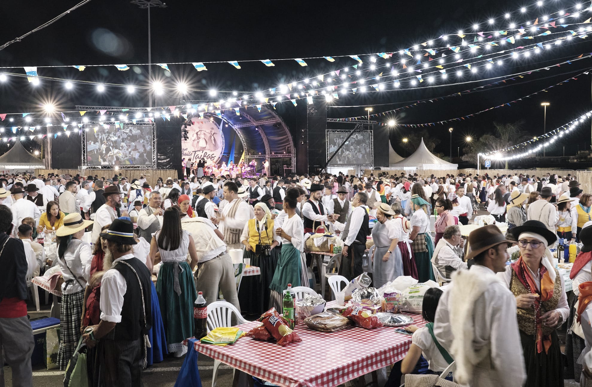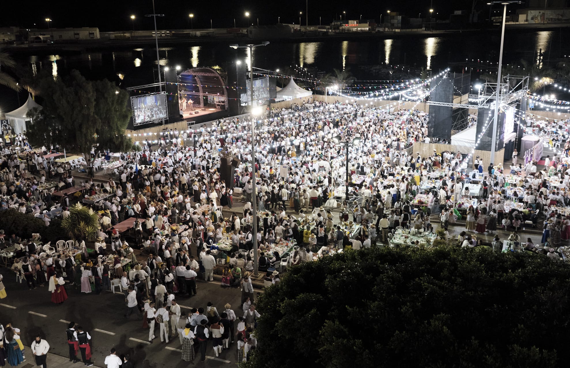 A las 21:00 horas de la noche comenzaba oficialmente el tradicional Baile de Taifas de Fuerteventura donde cientos de familias, asociaciones y colectivos colmaron las más de 250 mesas disponibles para la gran cena donde no faltaron platos con gran historia y tradición como el queso majorero, las papas arrugadas o el gofio.