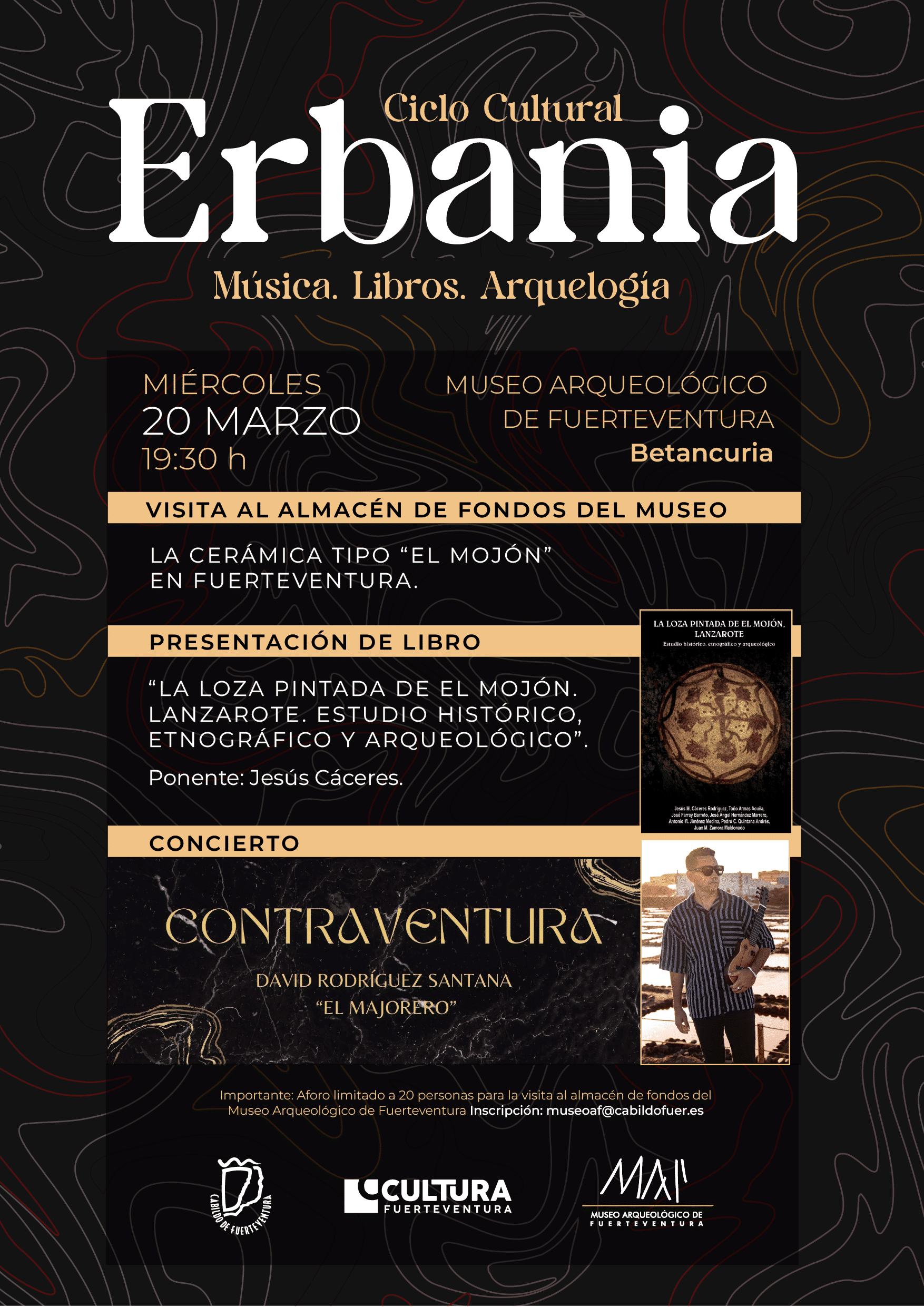 La programación comenzará el próximo miércoles, 20 de marzo, a partir de las 19.30 horas, con una visita al almacén de fondos del museo, donde los asistentes podrán conocer de primera mano los hallazgos en Fuerteventura de la cerámica tipo ‘El Mojón’, de Lanzarote, materiales que serán explicados por el arqueólogo Jesús Cáceres, que seguidamente presentará el libro *La Loza pintada de El Mojón. Lanzarote*. *Estudio histórico, etnográfico y arqueológico*. En el caso de la visita al almacén de fondos, es necesaria la inscripción a través del correo museoaf@cabuildofuer.es.