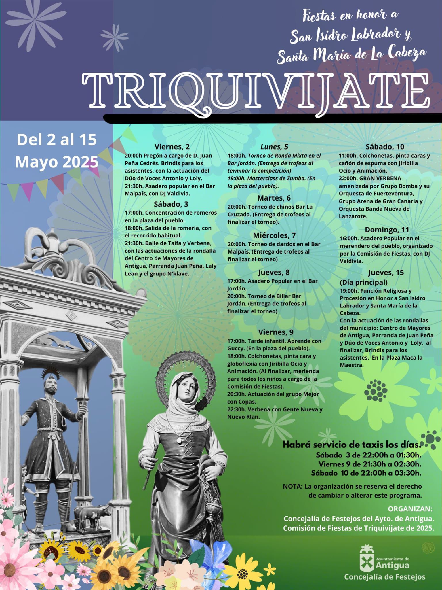 Las Fiestas de Triquivijate cumplen con la celebración en el calendario de sus fiestas patronales y se celebran del 2 al 15 de mayo, comenzando de la mejor manera, con un pregonero del que nadie duda y al que todo el mundo conoce, D. Juan Peña Cedrés, desde que lo propuse junto con el concejal de Festejos, Pedro Armas, toda la Comisión se ha volcado en organizar el mejor escenario y espectáculo que acompañe a un vecino y amigo, afirma el alcalde, Matías Peña.