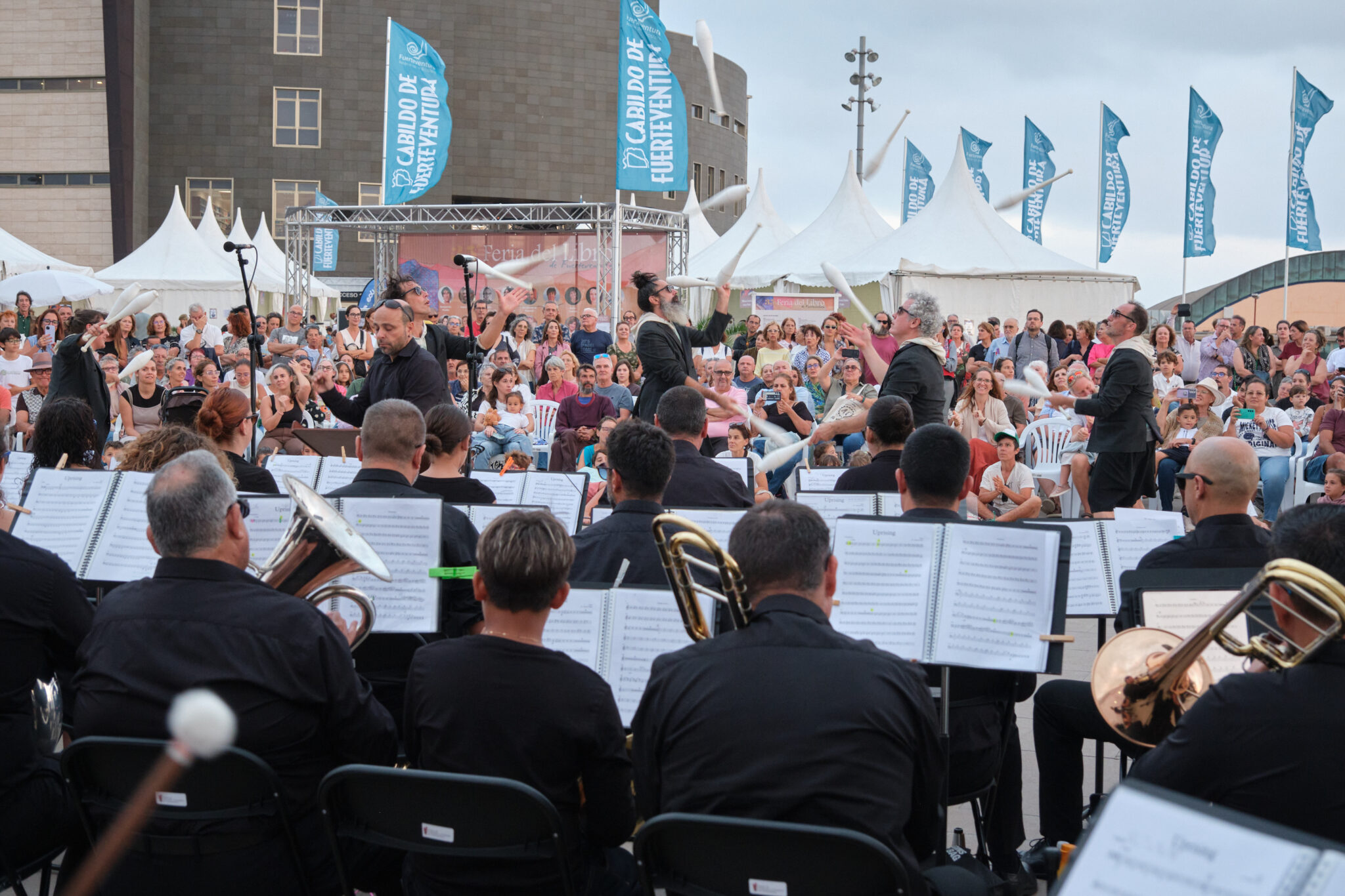 La plaza del Palacio de Formación y Congresos de Fuerteventura acogió este jueves, día 23 de octubre, el acto de apertura oficial de la 35 edición de la Feria del Libro de Fuerteventura. La agenda del encuentro cultural, que se extenderá hasta el próximo domingo día 26, incluye la participación de una veintena de autores y arrancó con el espectáculo ‘Orquesta de malabares’, a cargo de la compañía gallega Pistacatro, Premio Nacional de Circo 2025.