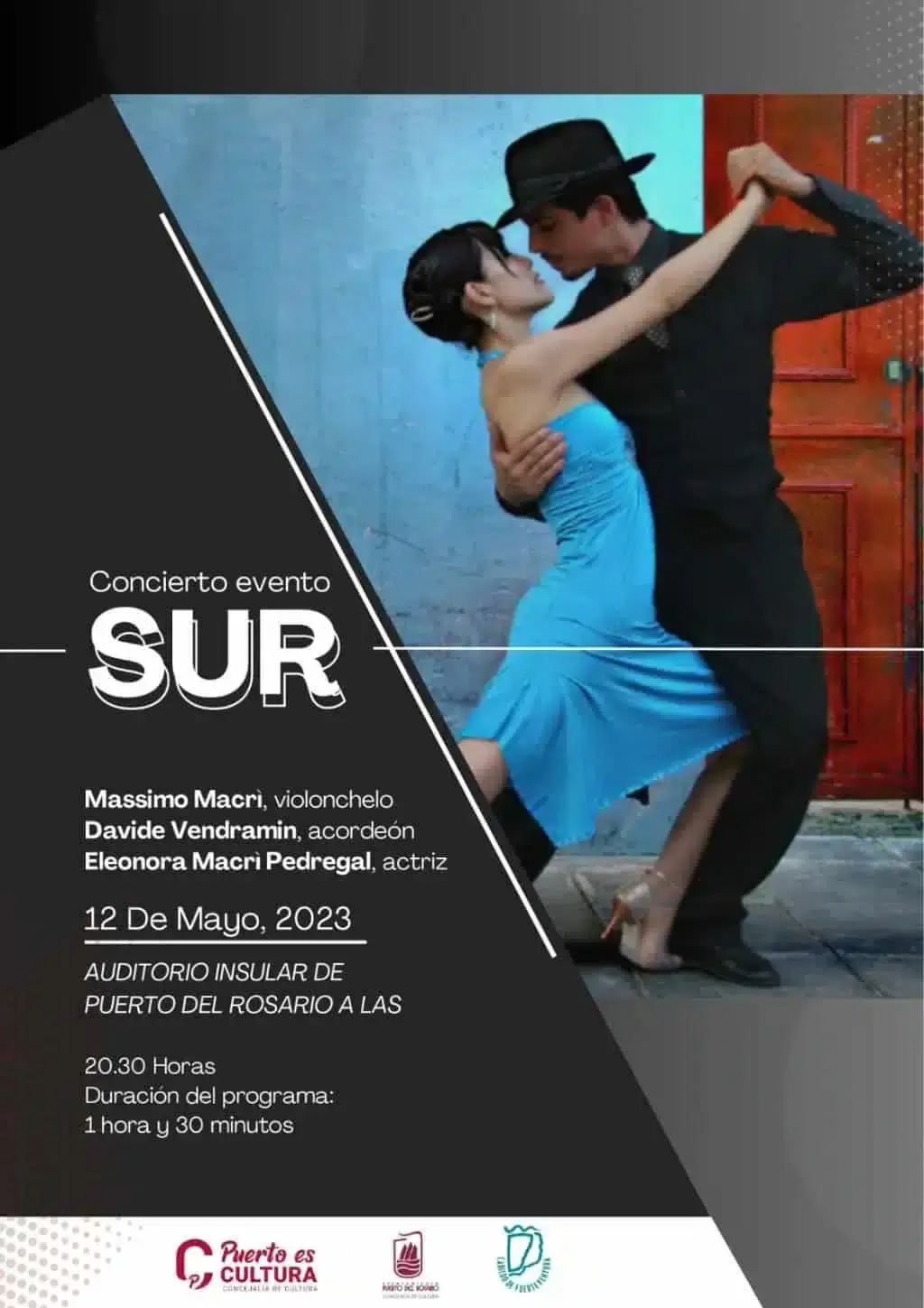 El proyecto artístico musical denominado ‘Sur’ llega al Auditorio Insular de Puerto del Rosario el próximo viernes, 12 de mayo, a partir de las 20:30 horas de la mano de artistas internacionales de la talla del violonchelista Massimo Macrì, violonchelo solista de la Orquesta Sinfonica Nazionale de la Rai – Italia; el bandoneonista y acordeonista Davide Vendramin; y de la joven actriz ítalo-española de madre canaria Eleonora Macrì Pedregal.