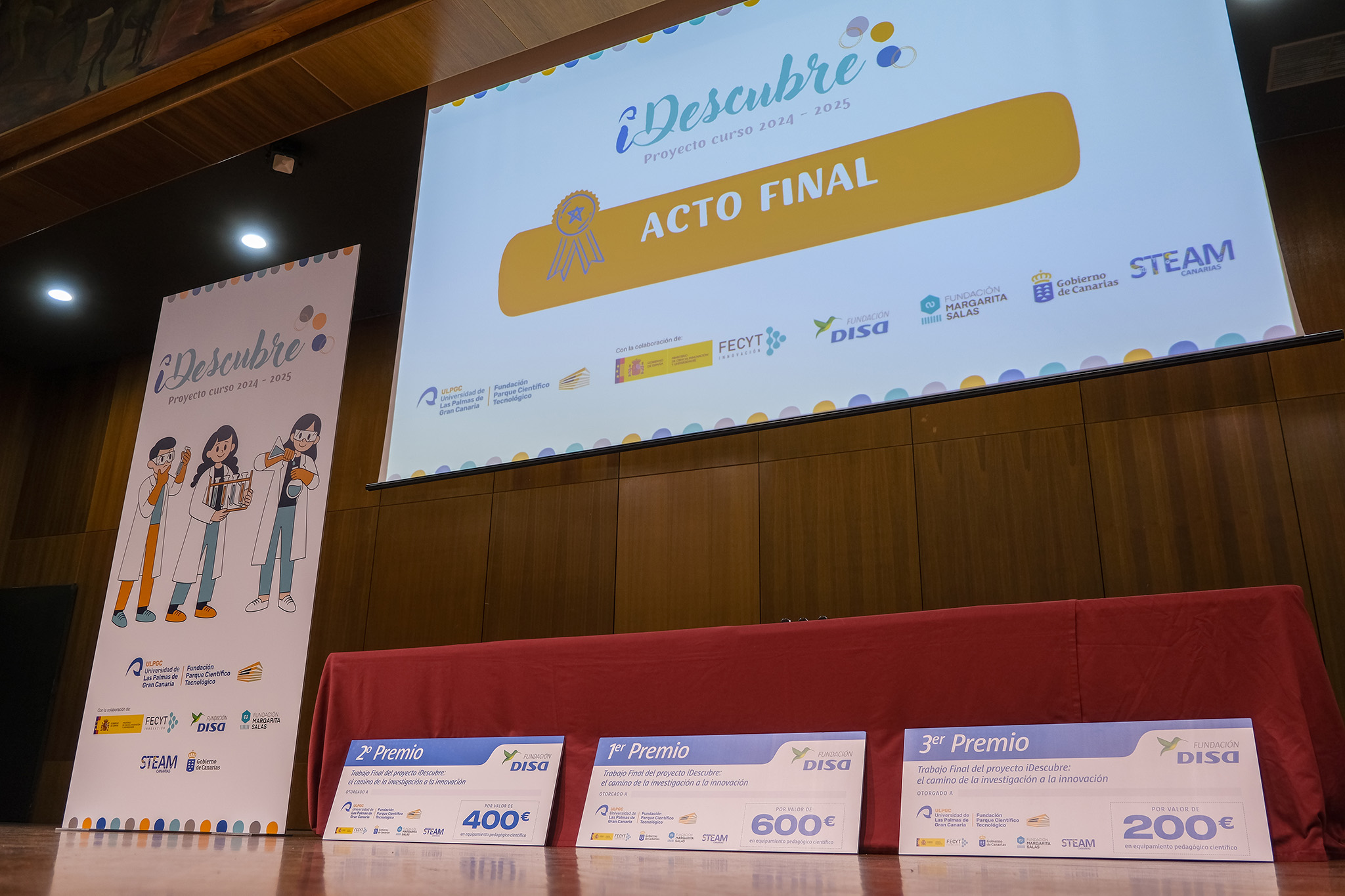 El Paraninfo de la sede institucional de la ULPGC ha acogido, el martes 10 de junio, el evento final de iDescubre, en el que 12 de los centros participantes han competido exponiendo sus trabajos relacionados con la ciencia y la innovación, además de asistir a una ponencia divulgativa impartida por el Catedrático del Departamento de Patología Animal, Anastasio Argüello Henríquez.