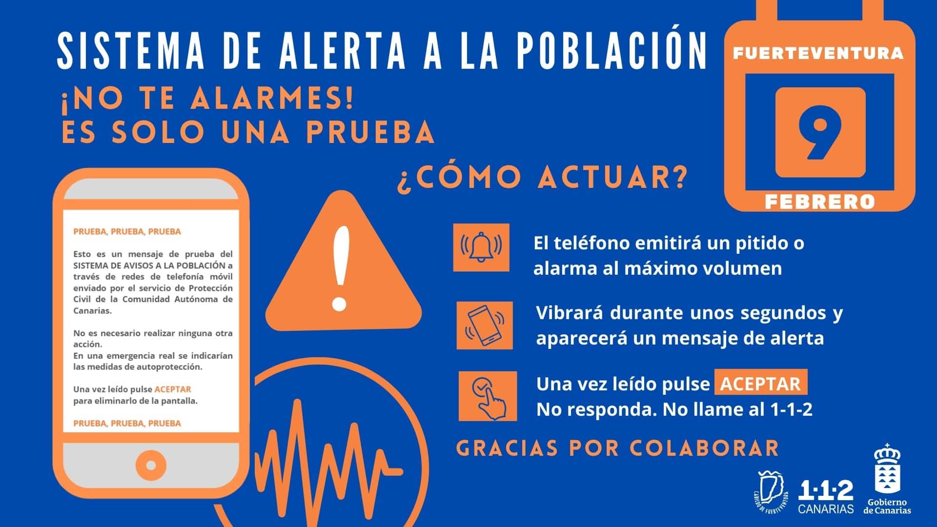 La prueba está organizada por el Gobierno de Canarias, a través de la Dirección General de Emergencias y el 1-1-2 Canarias, en colaboración con el Cabildo de Fuerteventura y los ayuntamientos de La Oliva, Puerto del Rosario, Betancuria, Antigua, Tuineje y Pájara. El mensaje se emitirá entre las 10:00 horas y las 12:00 horas por lo que las personas pueden recibirlo en el momento del envío o al entrar en zona de cobertura de su operadora telefónica, si se encontraba fuera de ella. No lo recibirá si su teléfono está apagado o en modo avión. Una vez aceptado el mensaje, desaparecerá de la pantalla del teléfono móvil.
