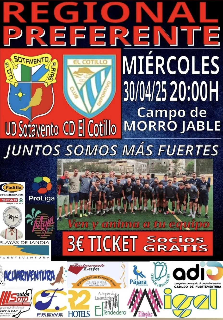 Este miércoles, 30 de abril de 2025, a partir de las 20:00 horas, el Campo de Morro Jable será el escenario de un importante partido de la Regional Preferente entre la UD Sotavento y el CD El Cotillo.