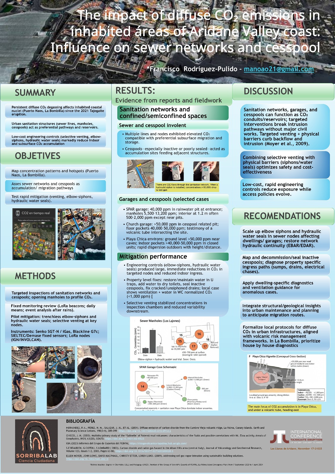Sus conclusiones las apoyó, por un lado, en el análisis de redes institucionales implantadas en esta emergencia (LoRa IGN, DEMASE y AlertaCO₂) que “demuestran que sin haber cesado las emisiones de este gas, hoy se puede vivir con seguridad razonable en estos barrios, donde se gestiona el riesgo”; y, por otro, un póster con ensayos de campo de muy bajo coste que explican por qué el problema se concentra en las redes de saneamiento y espacios confinados, y cómo mitigarlo de forma efectiva.