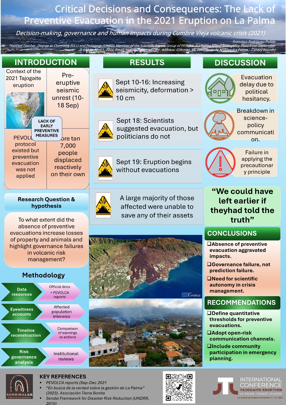 Y cerró su intervención con un mensaje a la comunidad científica: “Nunca deben olvidar que ustedes han investigado un fenómeno de la naturaleza, una erupción volcánica; pero, por el lugar y el impacto que esta ha tenido, no ha sido una catástrofe natural. Ha sido una catástrofe humanitaria, y aún lo sigue siendo. Nunca deben olvidar la perspectiva de la Geoética y la relevancia de la verdad vivencial, de las personas afectadas, muy por encima de la verdad factual, de los datos y las evidencias científicas. Sin la verdad vivencial, la ciencia aporta poco a la sociedad.”