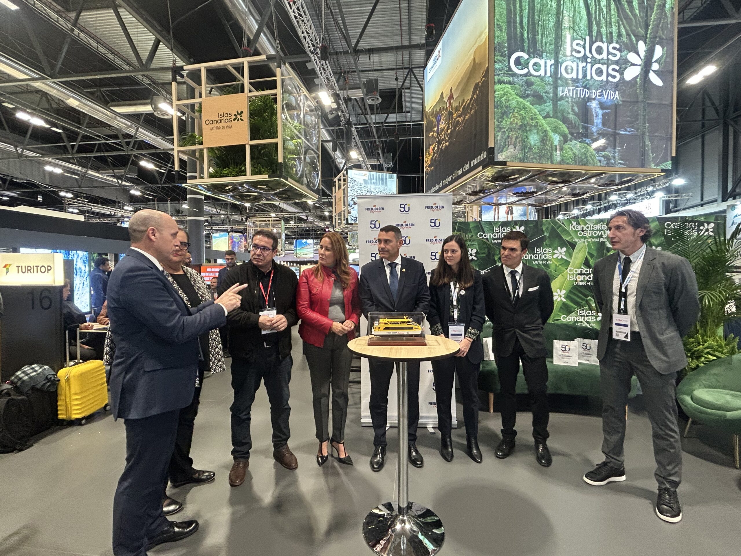 Fred. Olsen Express ha presentado hoy en la Feria Internacional de Turismo de Madrid (FITUR) su nuevo miniferri para excursiones. La naviera ha dado a conocer a autoridades de Fuerteventura y Lanzarote el barco Buganvilla Express, con el que quiere contribuir a potenciar las visitas turísticas cortas entre las dos islas. Esta nueva embarcación busca ofrecer una modalidad de viaje cómoda y rápida, que consolida el modelo de transporte de pasajeros sin vehículo desde su puesta en marcha en abril de 2022.
