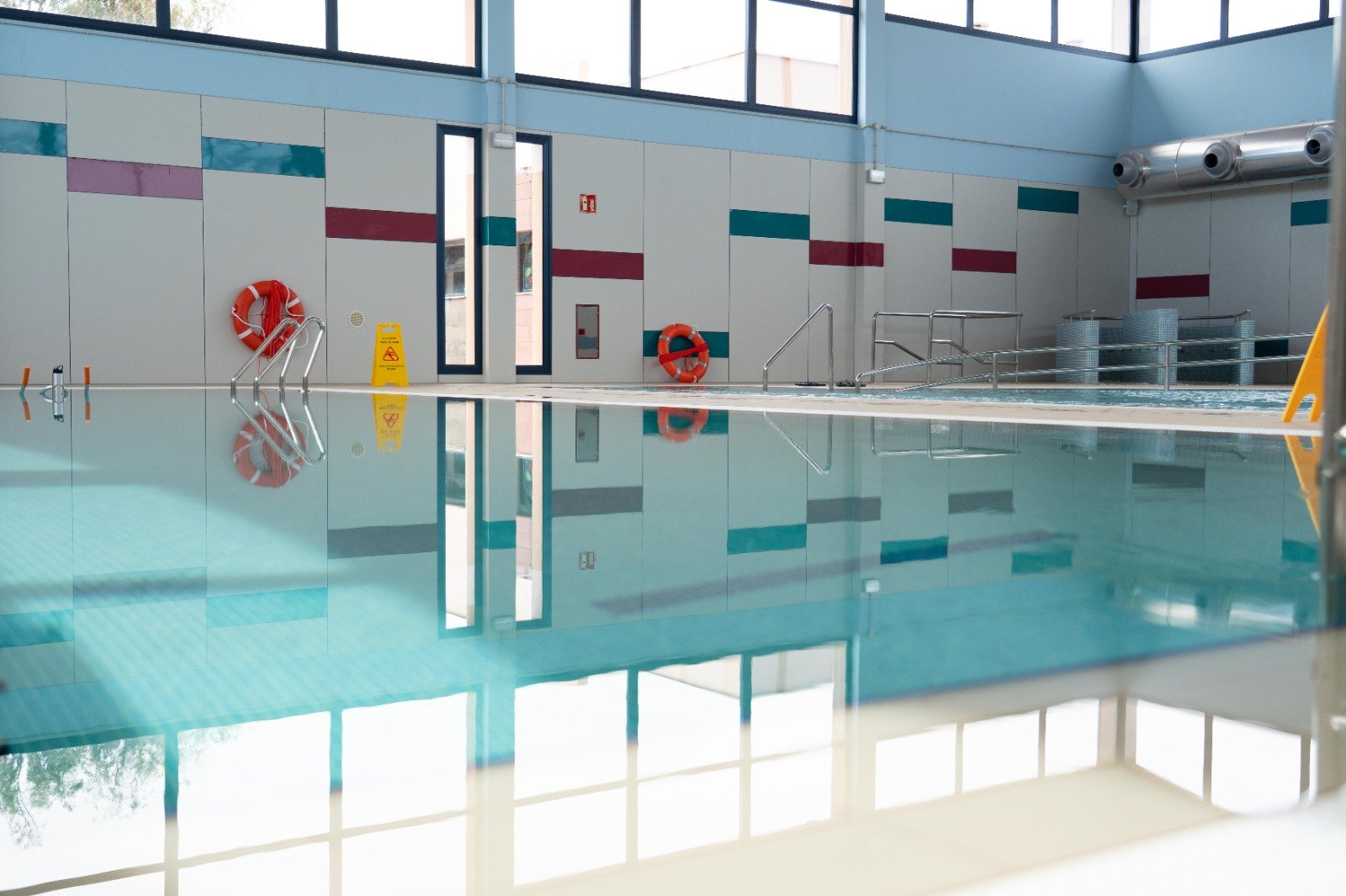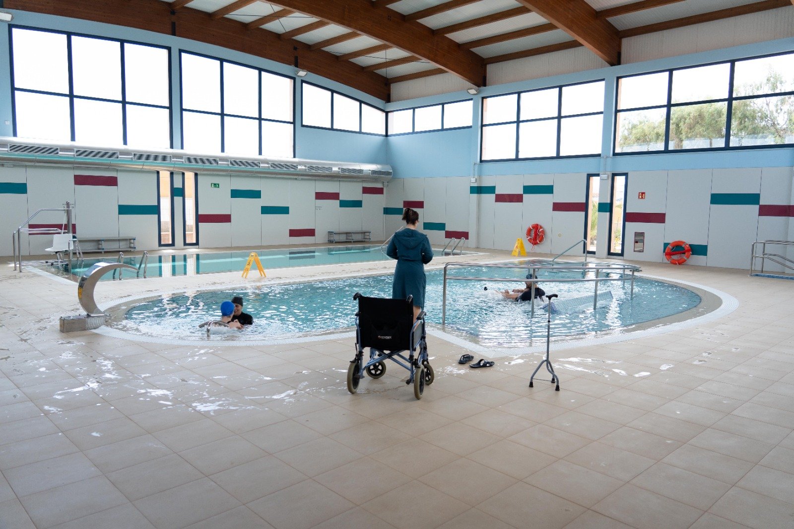 La piscina principal cuenta con elevador hidráulico y accesos adaptados. A esto se suma un vaso específico de hidroterapia con camas de aire, jets de masaje y cascadas terapéuticas.