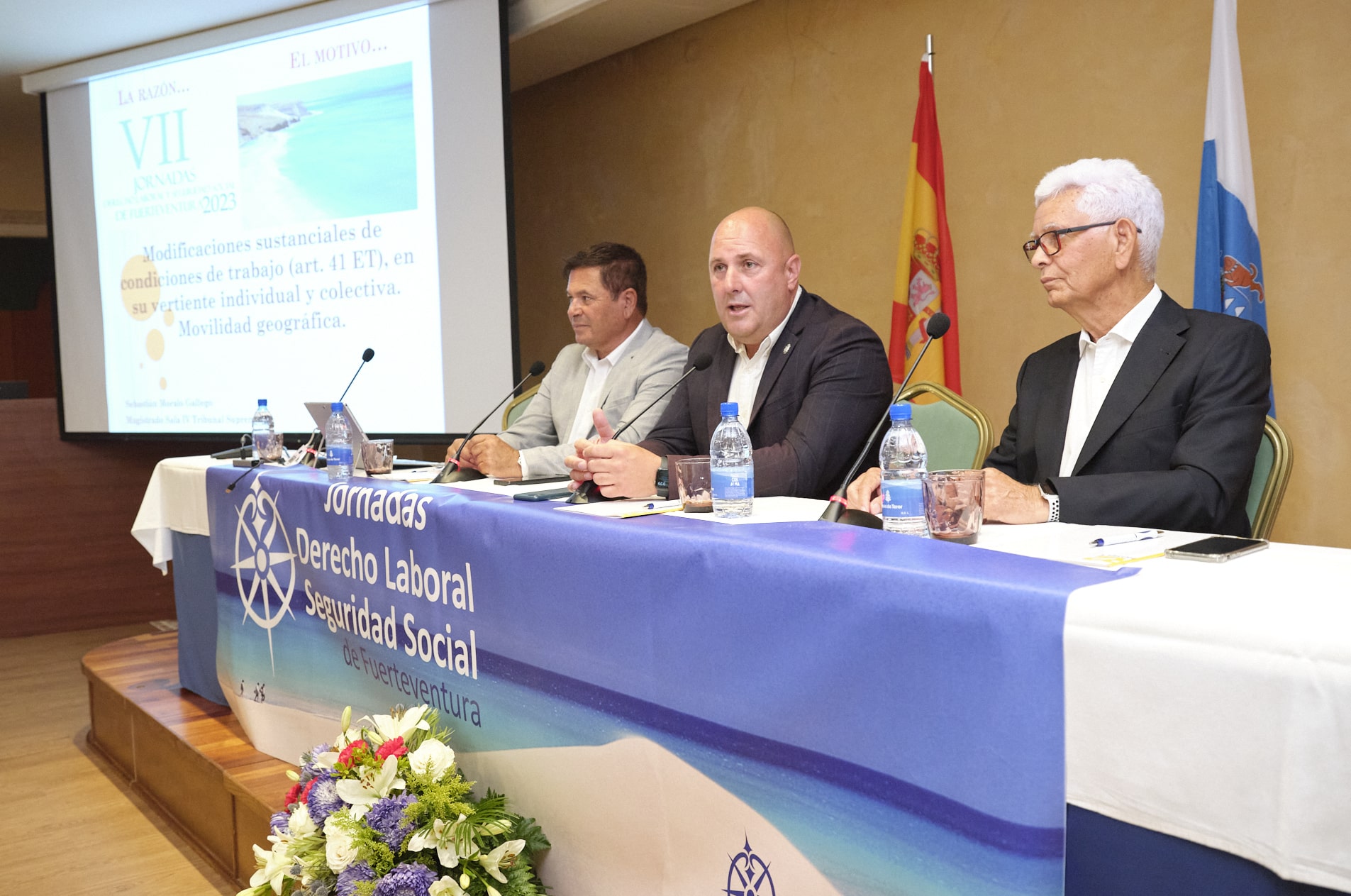 El presidente en funciones del Cabildo, Sergio Lloret, y el alcalde de Pájara, Pedro Armas, inauguraron la séptima edición de las Jornadas de Derecho Laboral y Seguridad Social de Fuerteventura en Costa Calma.